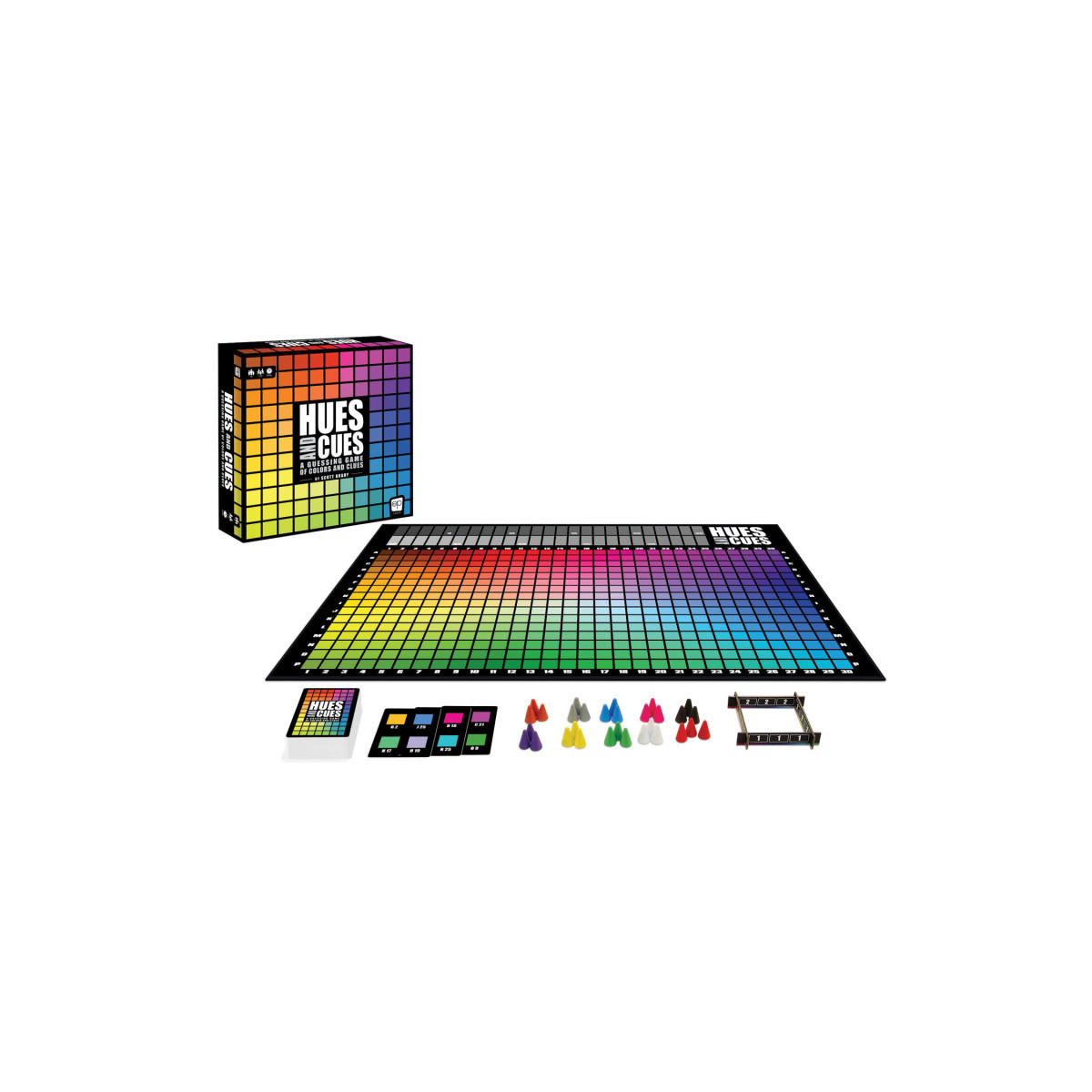 Hues and Cues What hue do you think of when we say "apple"? Hues and Cues is a vibrant game of colorful communication where players are challenged to make connections to colors with words. Using only one and two-word cues, players try to get others to guess a specific hue from the 480 colors on the game board. The closer the guesses are to the target, the more points you earn. Since everyone imagines colors differently, connecting colors and clues has never been this much fun! For 3-10 players, ages 8 and up.