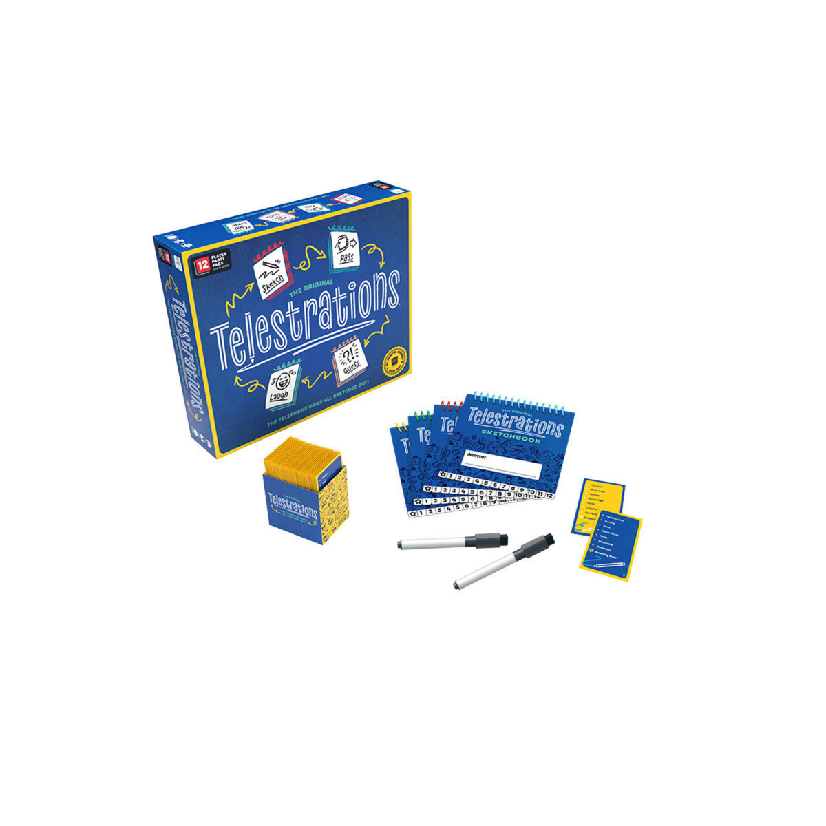 The Telestrations 12 Player Party Pack is the same award-winning sketch, pass & guess fun as The Original 8 Player Telestrations; only now the outcomes can go even further sideways with more players and 600 new words! Over 2,000 words, 12 erasable sketch books, 12 dry erase markers, 12 clean-up cloths. Perfect for parties, family reunions or to entertain a crowd. LOL fun for everyone! No Drawing Skills Required. Stick figures & sense of humor welcome! For 4-12 players, ages 11 and up.
