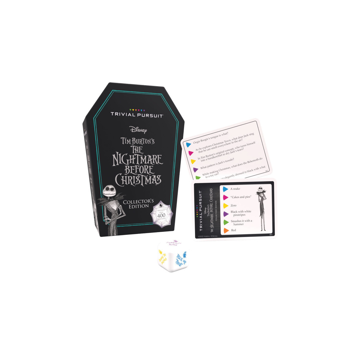 Tim Burton's The Nightmare Before Christmas Trivial Pursuit Travel Edition is the first and only game where fans can test their knowledge of this holiday classic with 420 trivia questions about the music, iconic movie characters, the Pumpkin King himself and much more! Get ready to test your The Nightmare Before Christmas trivia knowledge with 420 trivia questions from the classic Disney stop-motion musical film. This collectors edition of Trivial Pursuit is a great gift that any Nightmare Before Christmas fan or Disney lover would love to own and perfect for family game night!