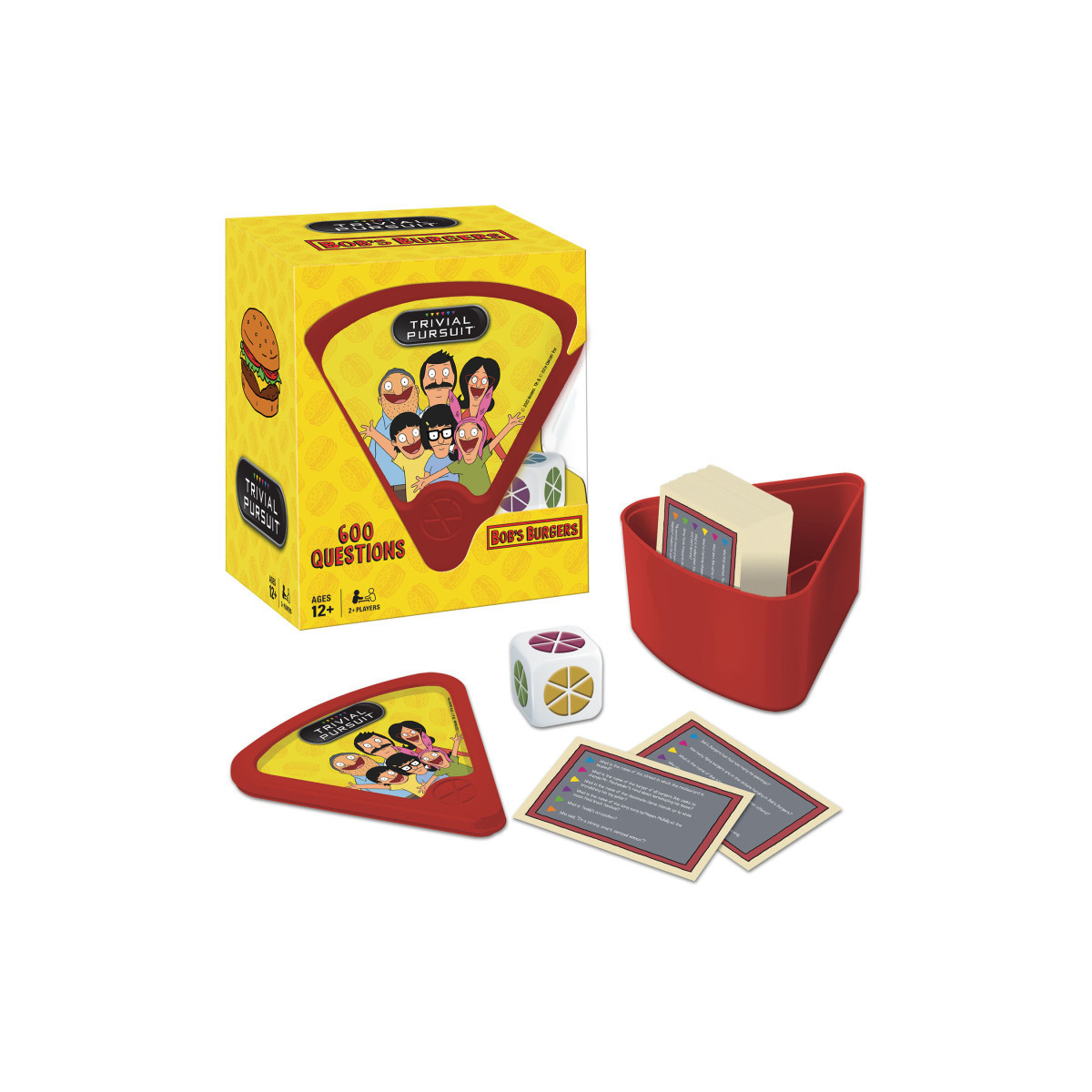 Grill your friends and family's knowledge of TV's fast food-slinging family with TRIVIAL PURSUIT: Bob's Burgers! With 600 questions spanning over nine seasons of the Fox series' crude humor and random antics. Players are tested to answer questions from six categories such as The Belchers, Food, Wagstaff School, Songs and Music, Townies and Who Said It to serve up the win alongside a Burger of the Day called the "Bob-B-Que and A".
