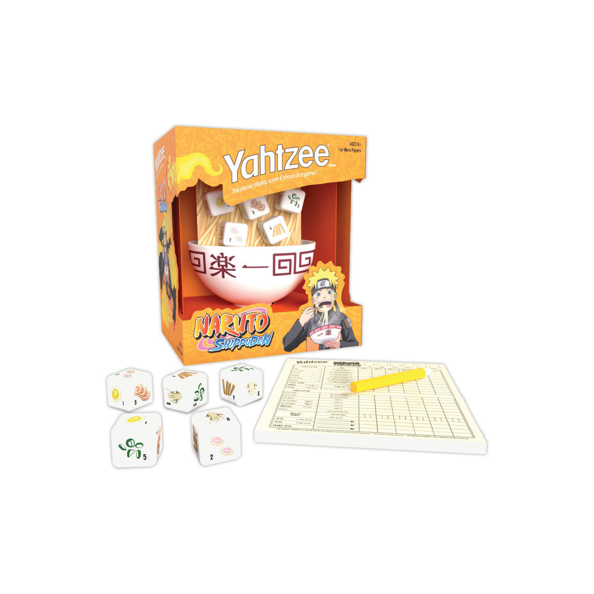 Refuel in between missions with this comforting take on Americas #1 dice game! Join your favorite ninja from the long-running anime Naruto Shippuden with YAHTZEE: Naruto and savor victory right out of a custom ramen bowl dice cup. Roll dice featuring the ingredients of his cherished Miso Chashu Pork soup to get the highest scoring combinations for a fast and gratifying win!