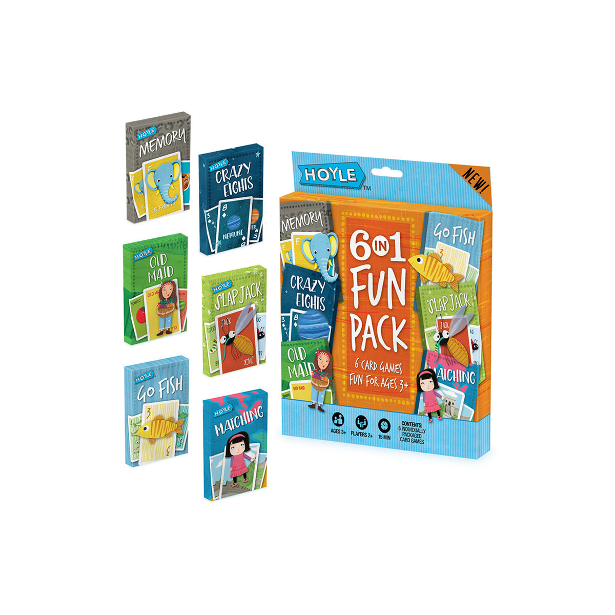 6-pack features a few of your favorite games – and some you'll delight in learning along with your young ones. Go Fish, Slap Jack, Memory, Matching, Old Maid, and Crazy Eights