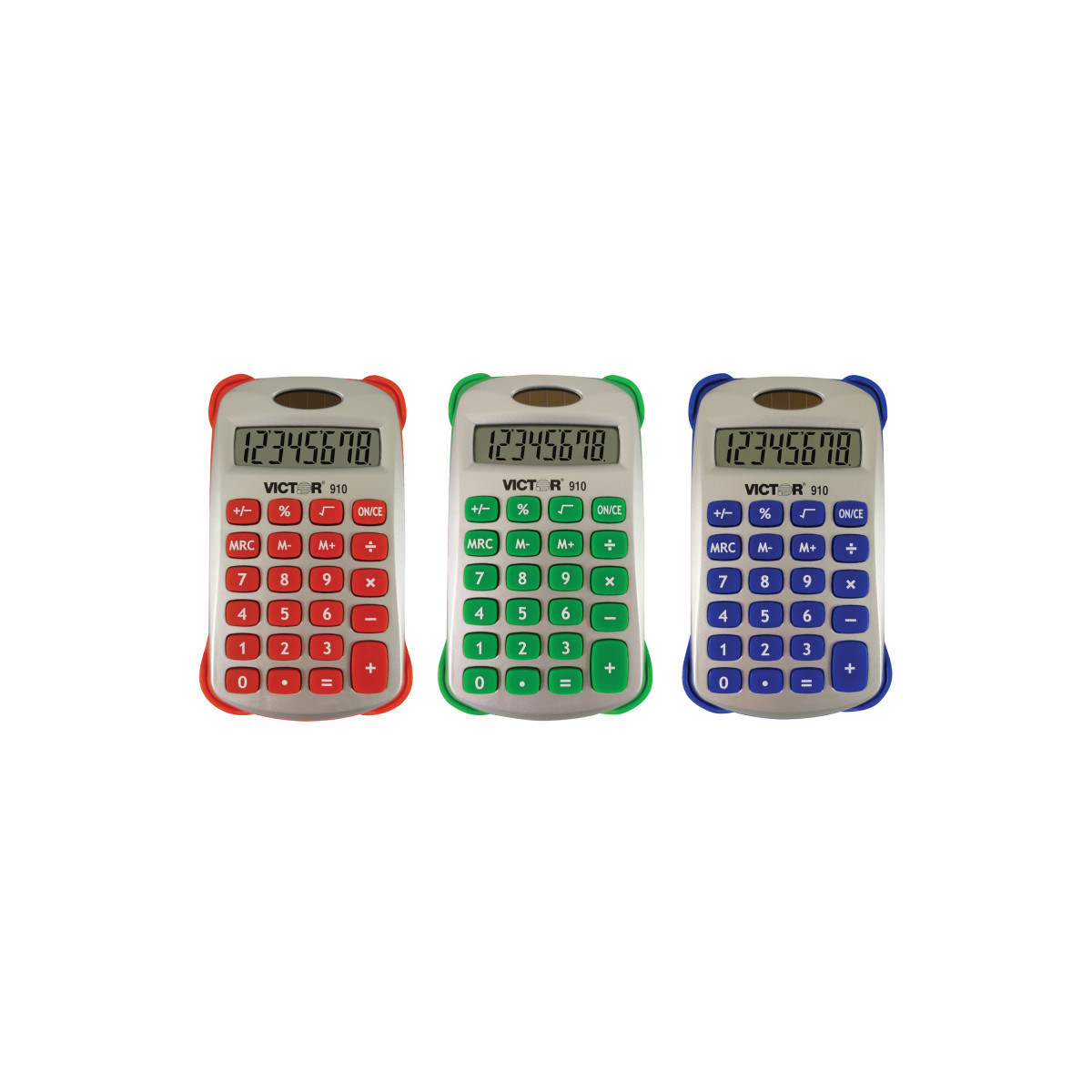 The Victor 910, 8 digit fun shaped calculator is perfect for school. Features a large LCD display. The calculator includes silver housing, uniquely-shaped rubber keys and a soft grip surround. Other functions include: 3 key independent memory, square root, change sign and percent keys. Operates on hybrid power (solar/battery backup). 2 year manufacturer's standard warranty. Assorted fun colors: red, green and blue (no color choice). Sold as a pack of 3.