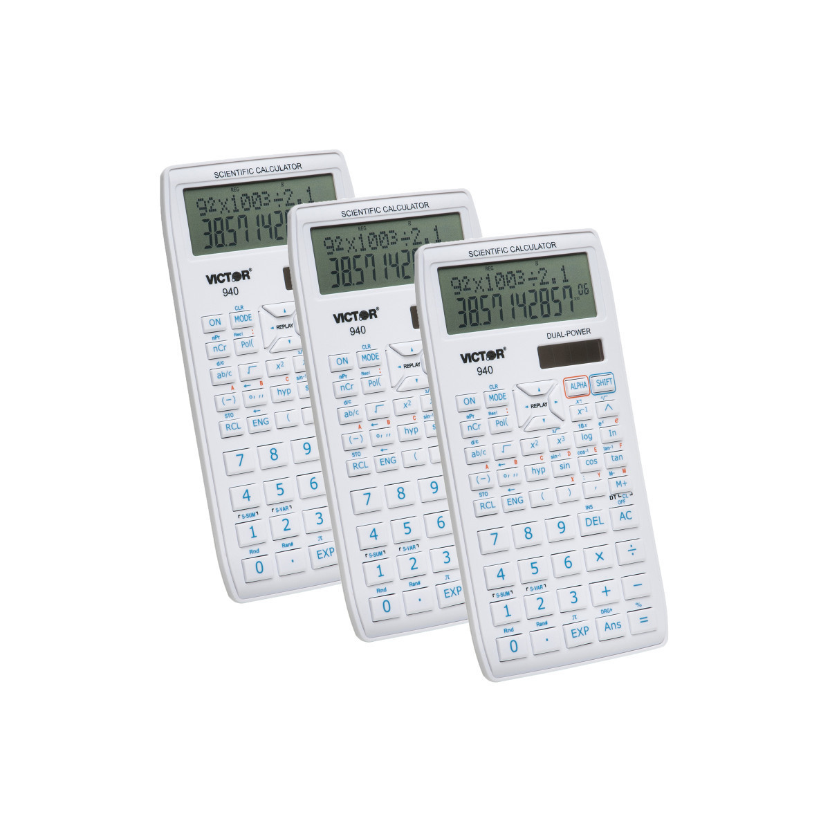 The Victor 940 10-digit advanced scientific calculator is perfect for students in General Math, Algebra 1 & 2, Science, Statistics, Trigonometry, and Geometry. 2-line display shows entries on the top line and results on the bottom. Other functions include: quadratic and cubic equations, coordinate conversion, trigonometric functions in degrees and radians, fractions, reciprocals, factorials, basic scientific functions, and more. Includes a clear protective hard shell case. Sold as a pack of 3 calculators.