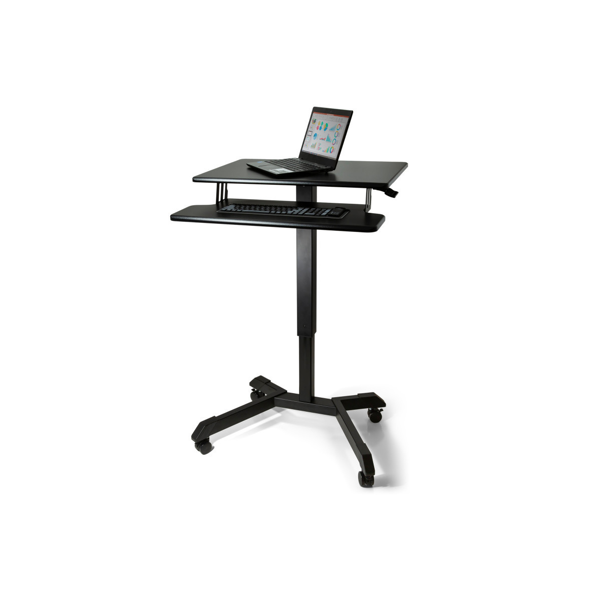 - Ergonomic benefits of a sit-to-stand desk plus the mobility of a cart