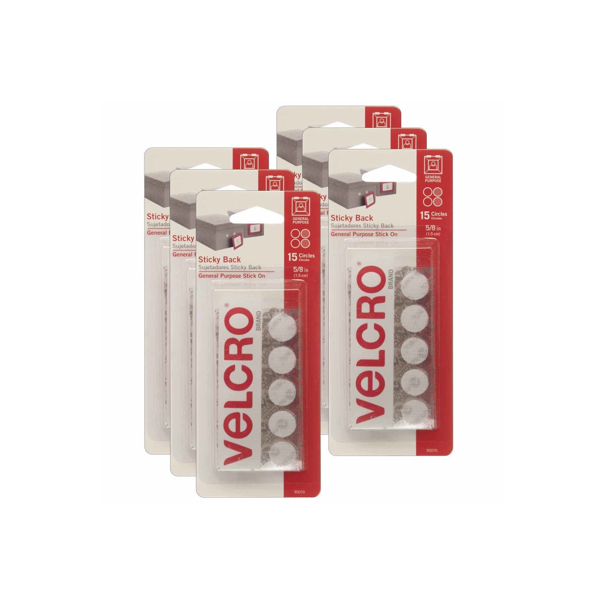 VELCRO® Brand Sticky Back hook and loop fasteners are ideal for smooth surfaces and can be used for indoor or outdoor applications. VELCRO® Sticky Back Tape can be trimmed into strips of different lengths with a pair of household scissors. Package contains 15 - 5/8" coin shaped tabs. Sold as 6 packs, 90 pieces total.