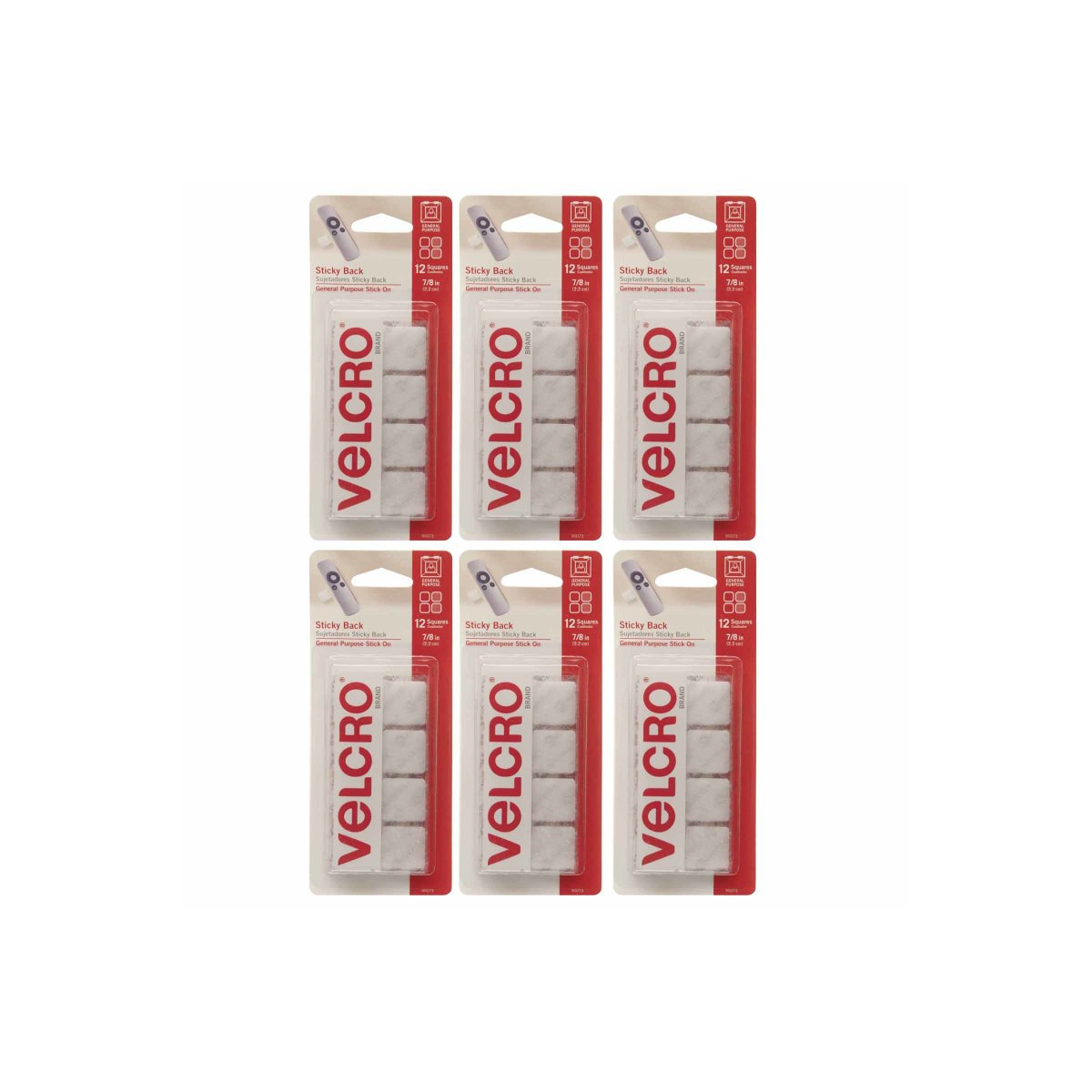 VELCRO® Brand Sticky Back hook and loop fasteners are ideal for smooth surfaces and can be used for indoor or outdoor applications. VELCRO® Sticky Back Tape can be trimmed into strips of different lengths with a pair of household scissors. Each package contains 12 tabs. The square-shaped tabs measure 7/8". Sold as 6 packs for a total of 72 tabs.