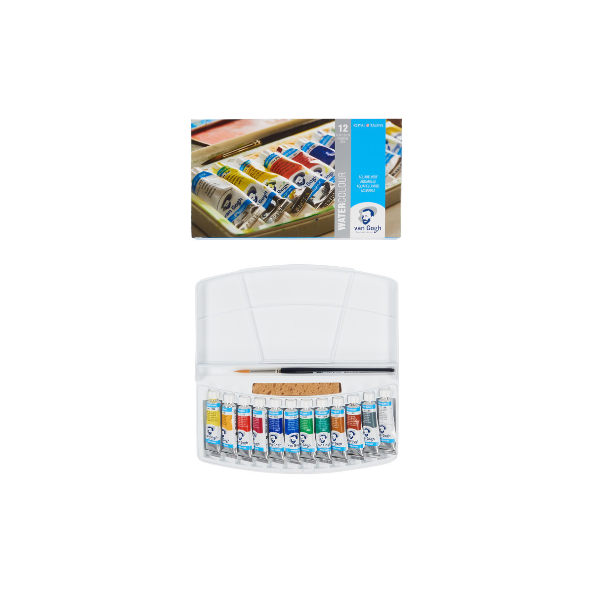 Van Gogh water colors are rated as a student and artist level paint range. They feature brilliant, transparent, and intense colors with high tinting strength. Most colors are rated with the highest degree of lightfastness +++ (100+ years under museum conditions) with a few colors rated just one step below at ++ (25-100 years under museum conditions). Thanks to the purity and uniform viscosity, these water colors are easy to work with and easy to mix. Proudly produced in Holland with stringent quality control for a consistent experience with every purchase. This 12x10ml tube water color set is packed in a plastic pocketbox, and also includes a round synthetic hair brush (size 6) and a sponge. Colors in this general selection set are: Permanent Lemon Yellow 254, Azo Yellow Medium 269, Permanent Red Light 370, Madder Lake Deep 331, Cobalt Blue Ultramarine 512, Ultramarine Deep 506, Permanent Green 662, Viridian 616, Yellow Ochre 227, Burnt Sienna 411, Payne's Grey 708, Chinese White 108