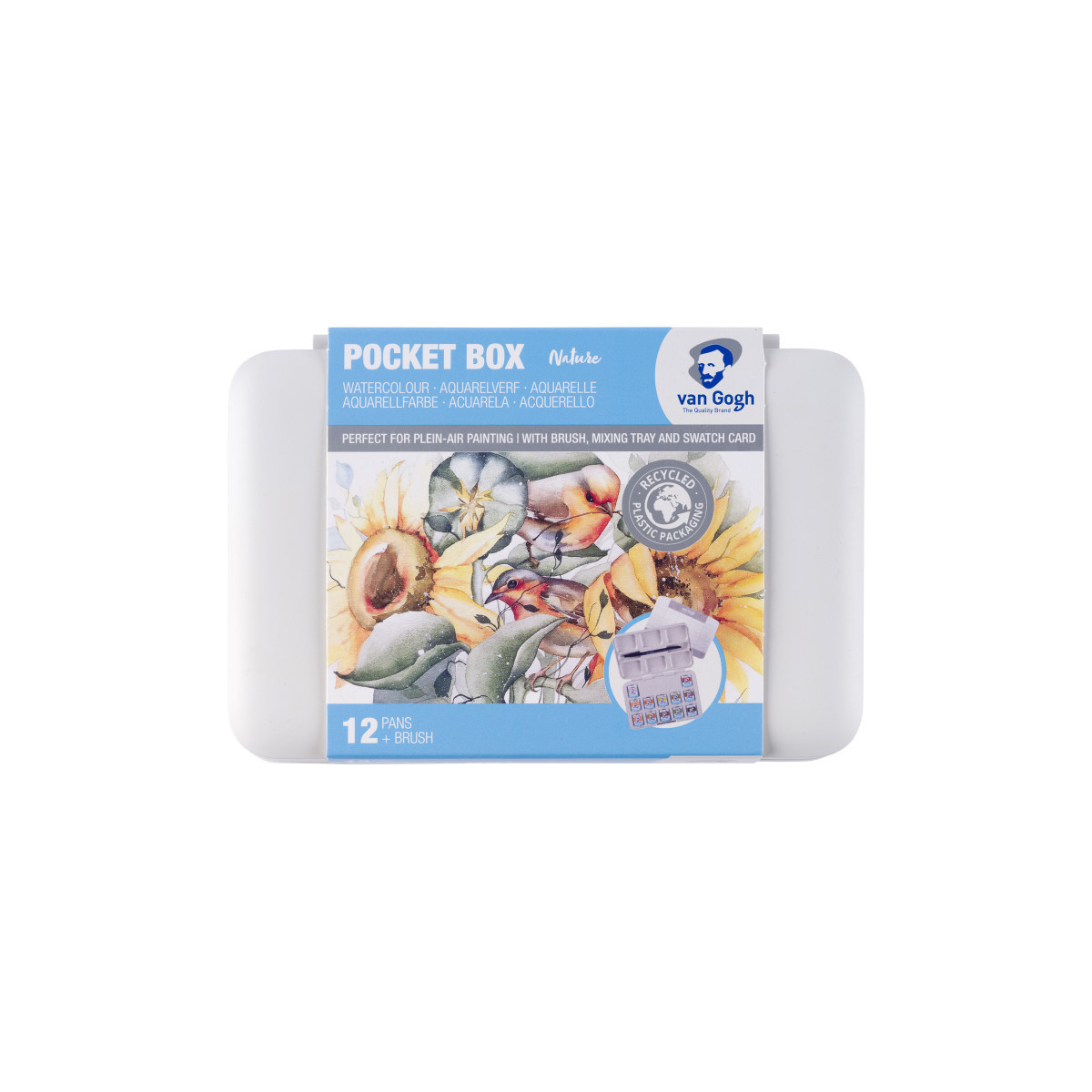 Van Gogh water colors are rated as a student and artist level paint range. They feature brilliant, transparent, and intense colors with high tinting strength. Most colors are rated with the highest degree of lightfastness +++ (100+ years under museum conditions) with a few colors rated just one step below at ++ (25-100 years under museum conditions). Thanks to the purity and uniform viscosity, these water colors are easy to work with and easy to mix. Proudly produced in Holland with stringent quality control for a consistent experience with every purchase. This 12-half pan water color set is packed in a plastic pocket box, and also includes a round synthetic hair brush (size 6) and a mixing tray.