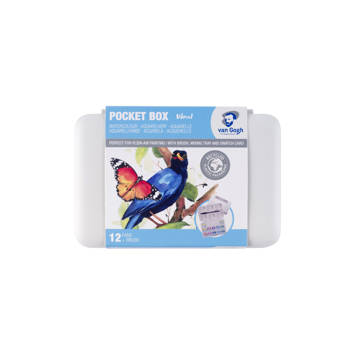Van Gogh water colors are rated as a student and artist level paint range. They feature brilliant, transparent, and intense colors with high tinting strength. Most colors are rated with the highest degree of lightfastness +++ (100+ years under museum conditions) with a few colors rated just one step below at ++ (25-100 years under museum conditions). Thanks to the purity and uniform viscosity, these water colors are easy to work with and easy to mix. Proudly produced in Holland with stringent quality control for a consistent experience with every purchase. This 12-half pan water color set is packed in a plastic pocket box, and also includes a round synthetic hair brush (size 6) and a mixing tray. Colors in this vibrant selection set are: Permanent Lemon Yellow 254, Transparent Yellow Medium 272, Pyrrole Orange 278, Permanent Red Light 370, Rose 357, Quinacridone Purple Blue 593, Ultramarine Deep 506, Cerulean Blue Phthalo 535, Turquoise Blue 522, Viridian 616, Permanent Green 662, Permanent Yellowish Green 633.
