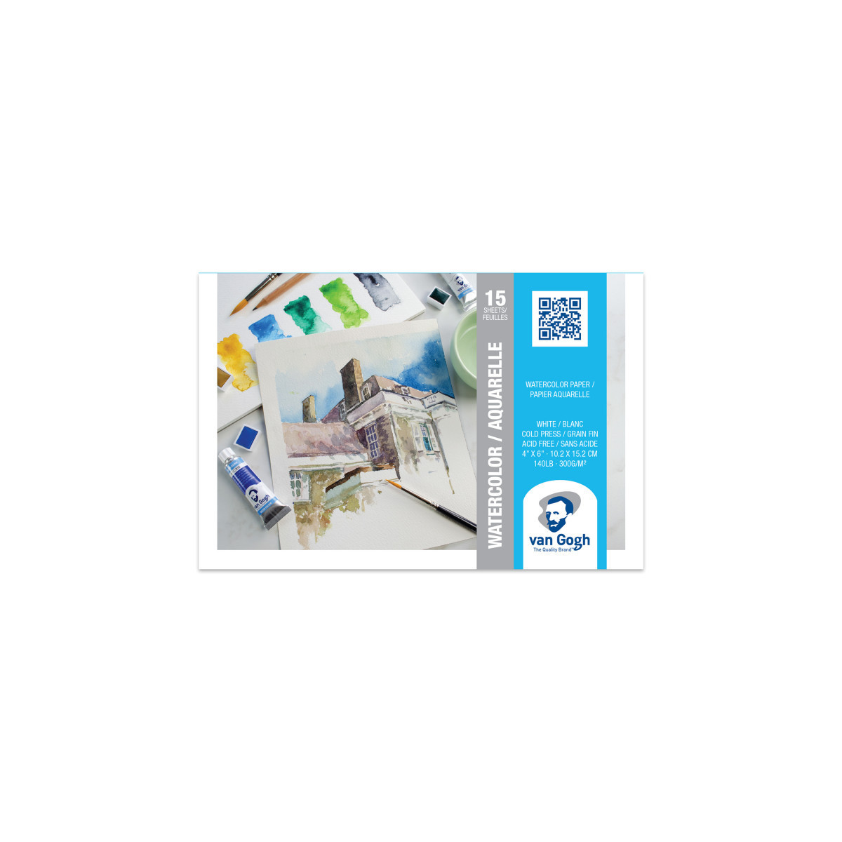 Van Gogh Cold Press Watercolor Paper White Pads and Blocks are artist-grade paper with a fine grain surface, 100% cellulose, 140 lb./300gsm, acid-free. Pads are glued on one side, blocks are glued on all four sides. Also suitable for use with tempera, gouache, acrylic, ink, charcoal and pencil.