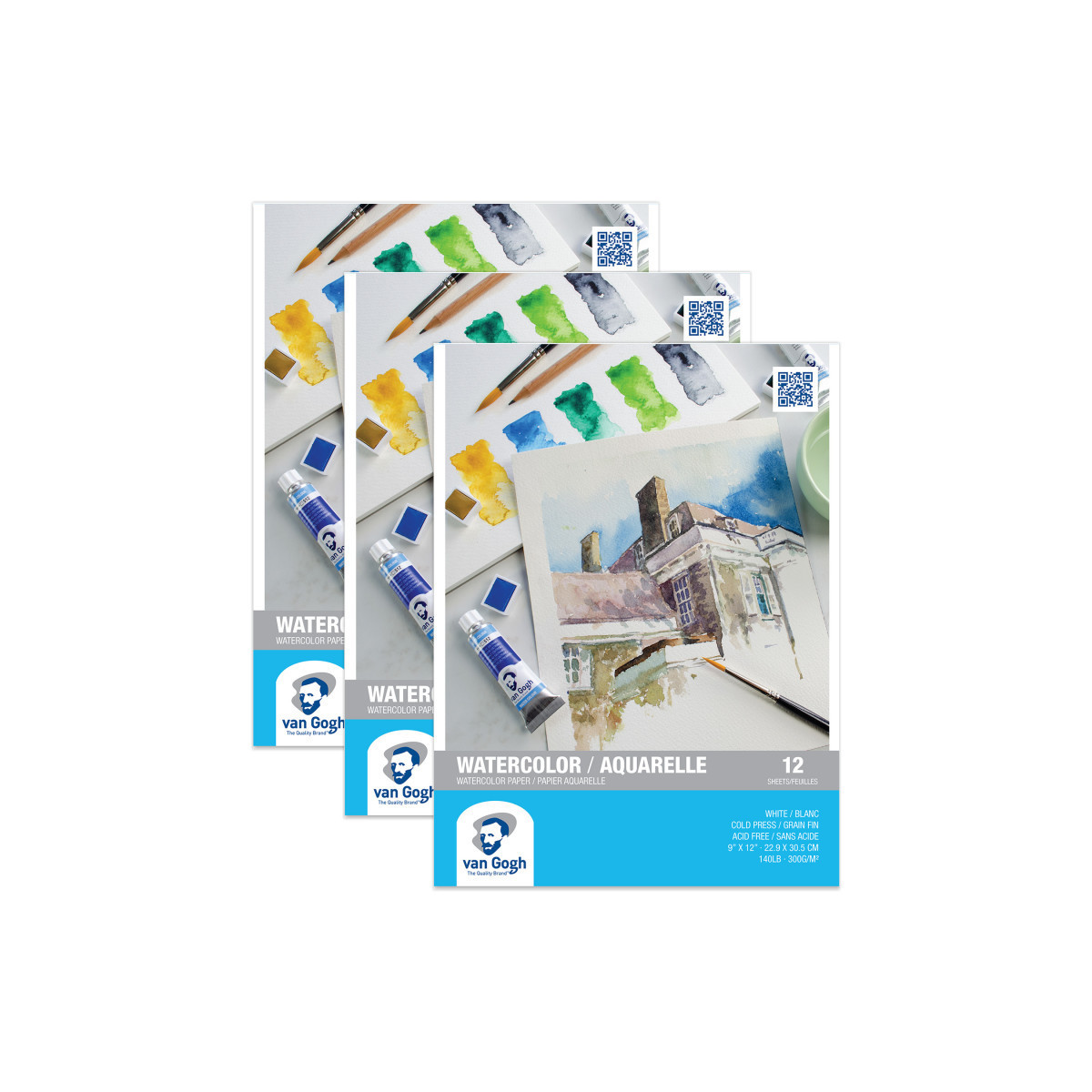 Van Gogh Cold Press Watercolor Paper White Pads and Blocks are artist-grade paper with a fine grain surface, 100% cellulose, 140 lb./300gsm, acid-free. Pads are glued on one side, blocks are glued on all four sides. Also suitable for use with tempera, gouache, acrylic, ink, charcoal and pencil. Sold as a pack of 3.