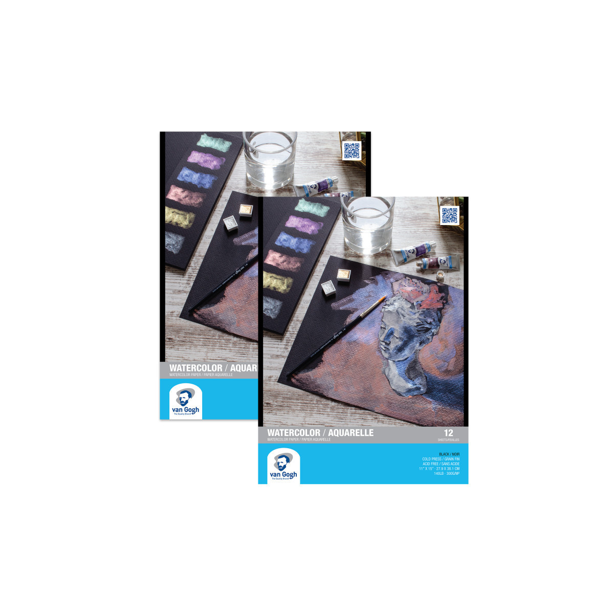 Van Gogh Cold Press Watercolor Paper Black Pads and Blocks are artist-grade paper with a fine grain surface, 100% cellulose, 140 lb./300gsm, acid-free. They are especially suited for use with metallic and interfernce colors. Pads are glued on one side, blocks are glued on all four sides. Also suitable for use with tempera, gouache, acrylic, ink, charcoal and pencil. Sold as a pack of 2.
