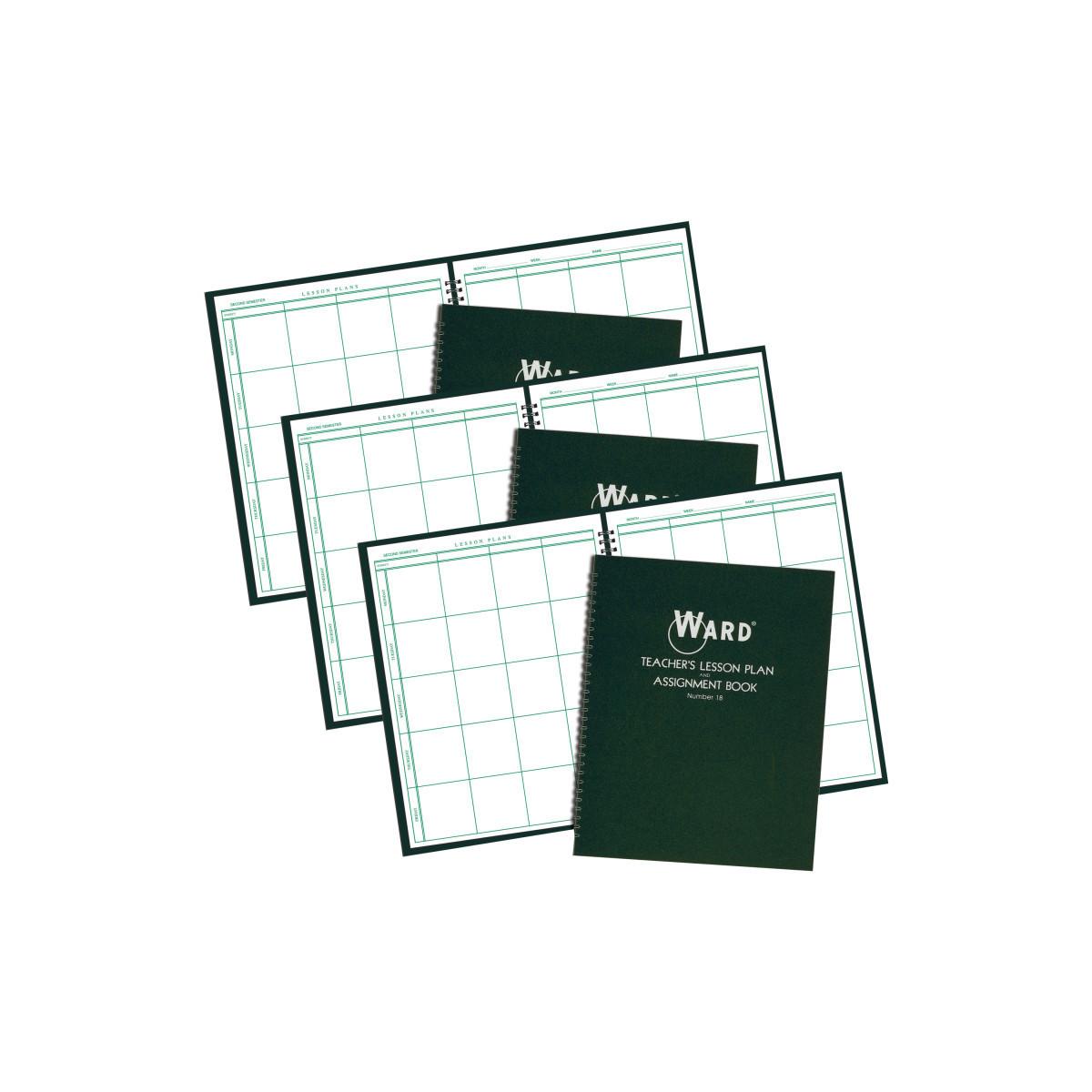 Ward Lesson Plan books are printed on high-quality white paper, with Ward’s signature Green Ink. All of Ward’s books contain a two-year calendar, seating charts, and school events schedule. Features a durable green cover with semi-concealed wire bindings. Includes a 8-period planner (44 weeks), school events calendar, and seating charts. Divided into 5-day weeks, with 8-period days. Page Size: 8.5 x 11. Sold as 3 identical books.