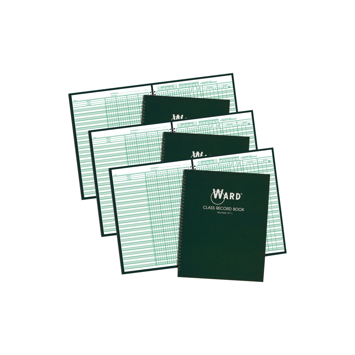 Ward books are as durable as they are functional, featuring the heavy, dark green cover material that users have come to rely on in WARD products. All WARD CLASS RECORD BOOKS are printed in green ink on quality white paper and bound in a durable, deep green cover. Semi-concealed wire binding allows the book to open flat for ease of use. Memorandum sheets and seating charts included in all books. 6-7 week grading periods. 8 1/2 X 11. 38 student names per page. Six grading periods with grading sheets for 36 to 42 weeks of school and 16 classes per year. Sold as 3 identical books