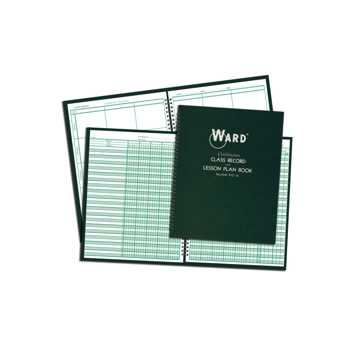 Ward Combination Class Record Book/Lesson Plan Book includes 9-10 week grading period with 38 student names per page. Four grading periods with grading sheets for 36 to 40 weeks of school and 16 classes per year. Six period plan book covering a school year up to 40 weeks. Each week divided into a five day week with 6 periods per day. Includes memorandum sheets and seating charts.