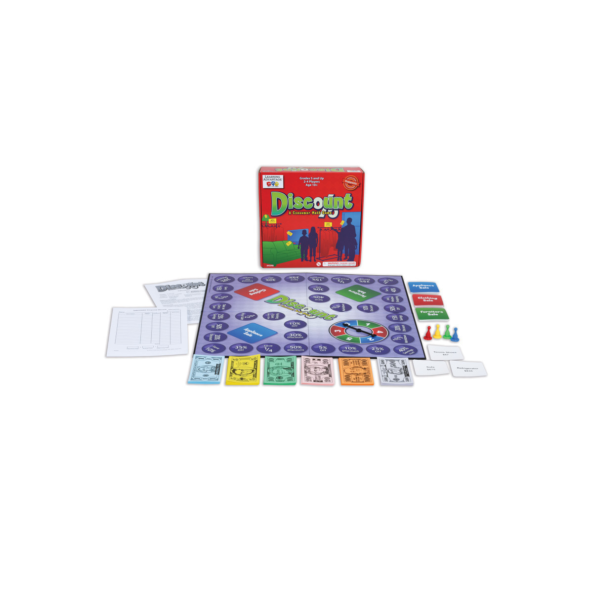 Discount brings players face-to-face with over 400 real-life challenges as they purchase furniture, clothing, and appliances. No series of problems is alike. Discount provides extensive experience in translating among fractions, decimals, and percents; computing percentages and fractional discounts using a calculator; rounding the amount saved; making correct payments and change; keeping accurate financial records of transactions; and reconciling accounts with cash on hand. As in business, the goal is 100% accuracy. Great for promoting financial literacy. For 2-4 players. Grades: 5+.