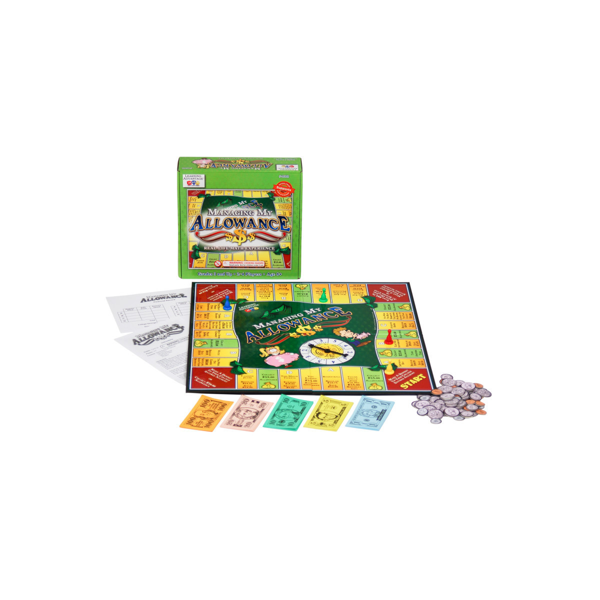 Managing My Allowance offers valuable first money experiences. Players use coins and bills to pay for purchases, compute change, handle allowances and gifts, collect earnings, and make deposits into college savings accounts. They are rewarded for accuracy, taking advantage of sales, saving money for college, and making thoughtful decisions. Transactions mirror the real world, adding value and excitement. Game variations offer two difficulty levels. In Allowance, the winner is the player with the most money in college savings. No financial transactions are recorded. In Managing My Allowance, players keep simple financial records. The winner is the player with the most money in college savings plus what is saved because of sales. 2-4 players.
