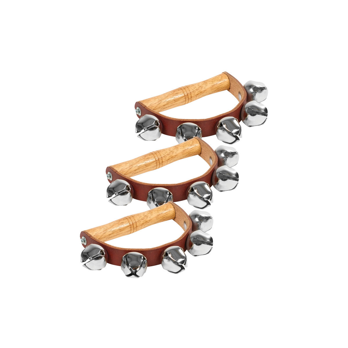 The Basic Beat Sleigh Bells include five bells mounted on a leather strap that is attached to a wooden handle