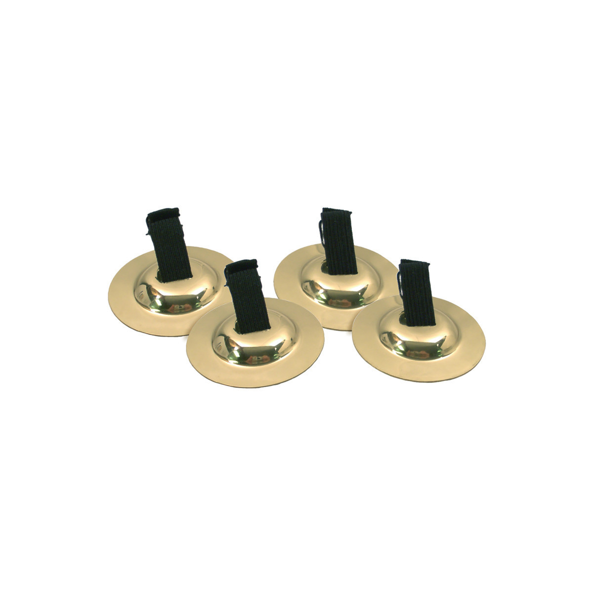 Set of 4 (2 pairs) stamped brass finger cymbals. Each set of 4 finger cymbals weighs 0.14 pounds. The black elastic straps are securely stitched in place while an attached silver buckle on each strap allows for adjustments in the length of the elastic to better fit individual fingers.
