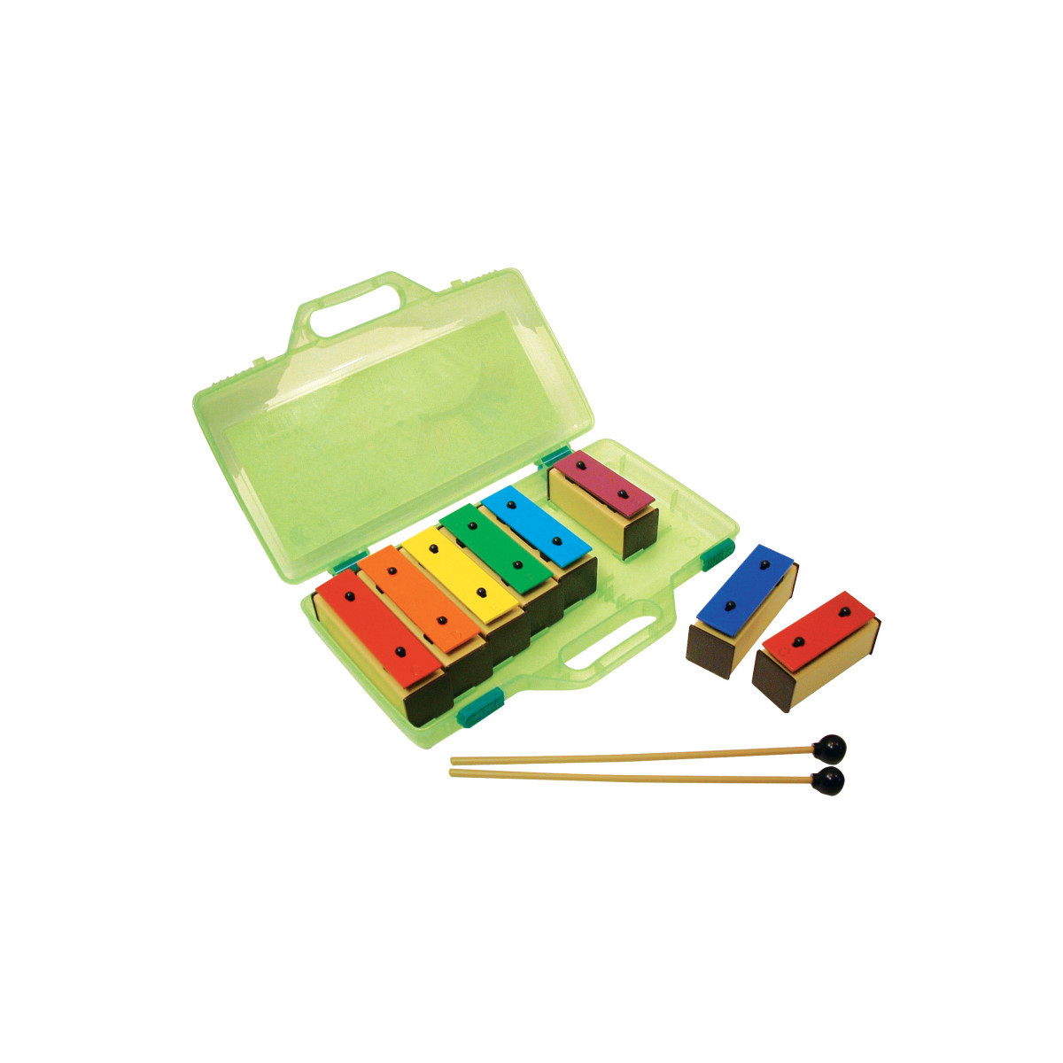 Brightly colored diatonic bell set with transparent case. Range is from middle c''' to c''''. Bells may be individually removed. One pair of mallets is included with the bells.
