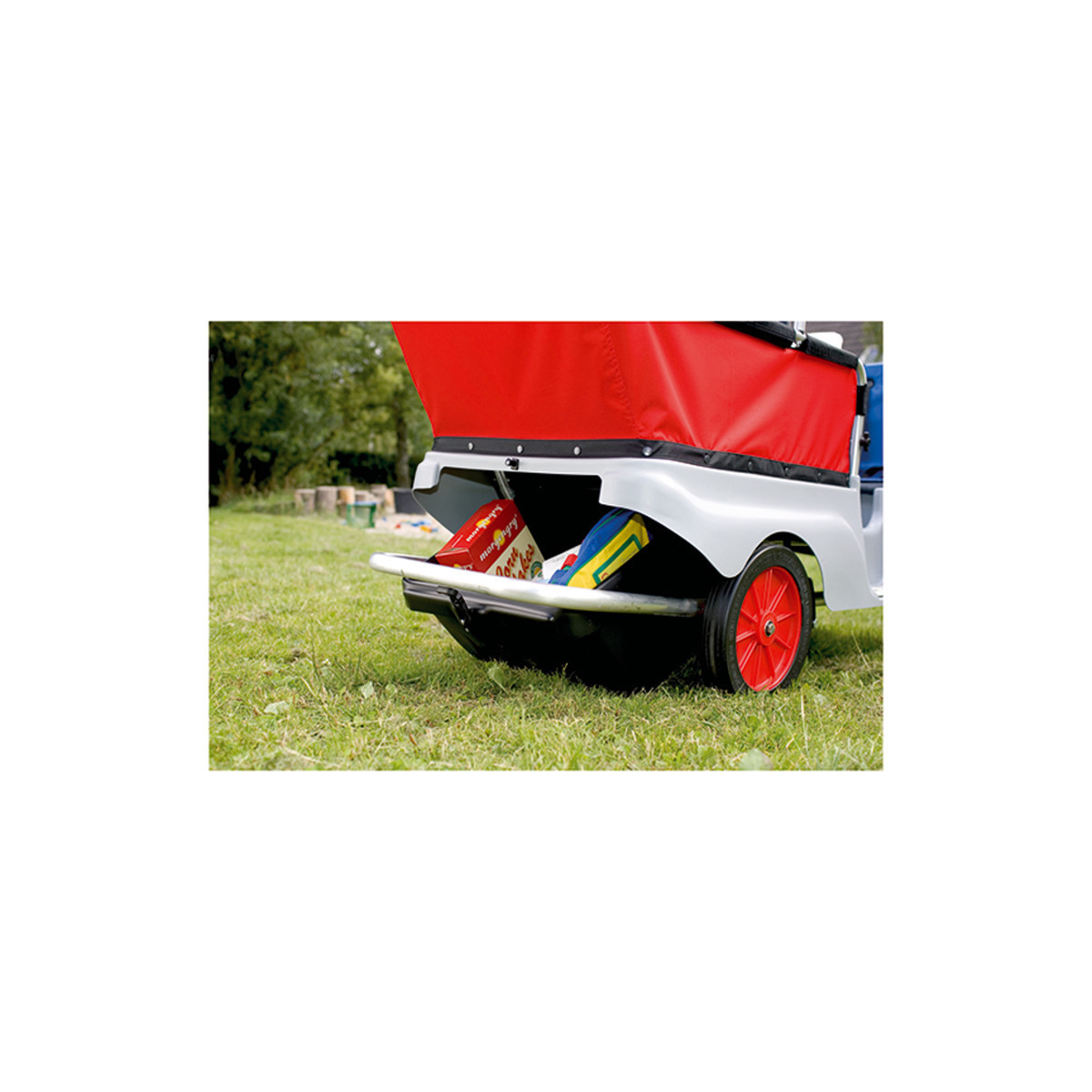 The perfect accessory for Winther's kiddy bus. It attaches snugly under the wagon. Storage tray is great for transporting items on the go. Used for storing packed lunches, clothes and more. Has room for 35 liters. Max 22 lbs.