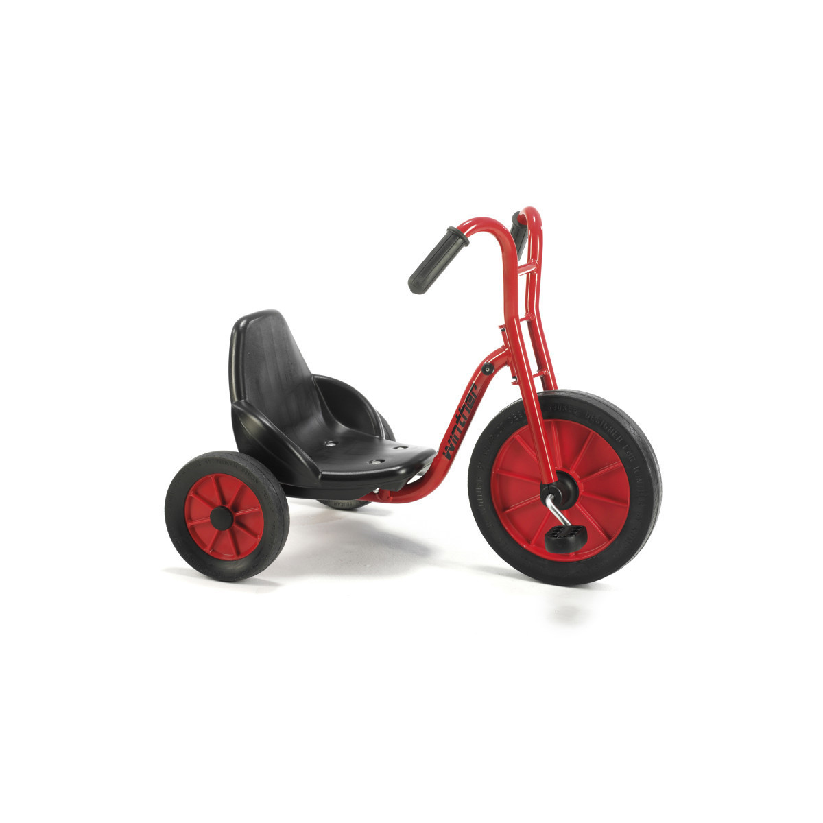 It's red and it's very cool. It has a low seat and a Harley-type handlebar. The large front wheel lets children work up a good speed and maintain momentum. We have even seen "big boys" cry when it was time for lunch and they had to stop playing with it. Harmonious, safe design with no sharp edges. Strong, oval-shaped tubes ensure maximum strength. Rubber stops to ensure children do not get fingers caught. Spokeless wheels with solid rubber tires. Strong, non-slip pedals. Solid one-piece steel crank.