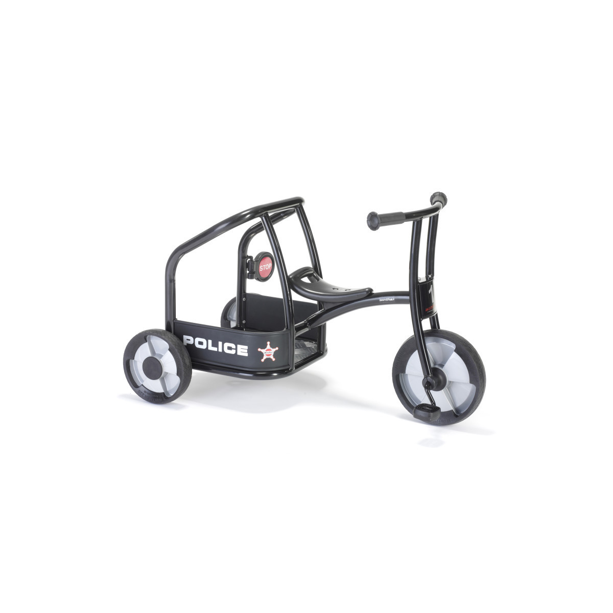 All bad guys better watch out. The police are here. This cool trike quickly becomes the natural center for social activities on the playground. Built-in steering limiter. Attractive new design with no sharp edges. Strong heavy duty tubes ensure maximum strength. Pedals and spokeless wheels made of polypropylene with solid rubber.