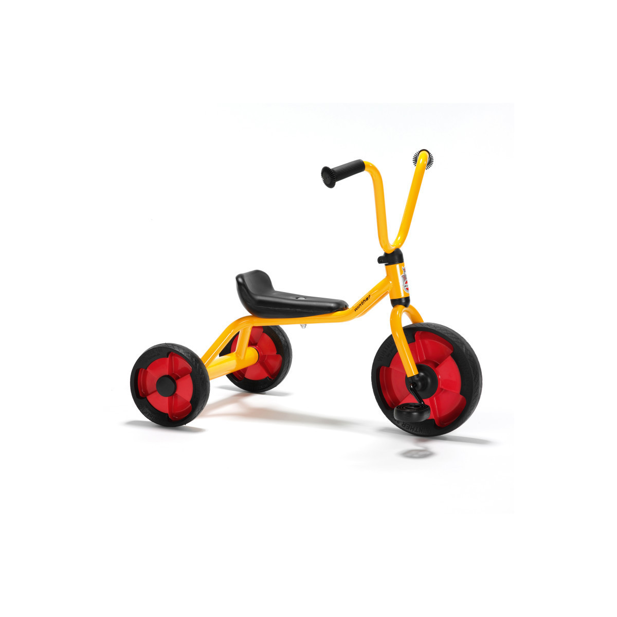 Even the smallest children can ride a Winther. This tricycle provides children age 1-4 with lots of fun. And at the same time, it develops and exercises their motor skills. A perfect match. Spokeless wheels with wide tires. Safety handlebars grips. Safe design featuring rounded-off shapes and no sharp edges. Strong nylon bearings for both front and rear wheels. Strong, non-slip pedals. Solid one-piece steel crank.