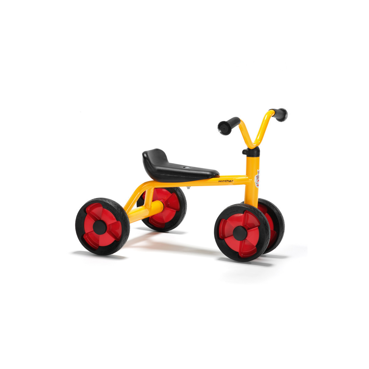 Pushbike for small toddlers. It is easy to ride and has two front wheels for that all-important safety. It is propelled forward using the feet and so supports the development of children's balance skills. Spokeless wheels with wide tires. Safety handlebars grips. Safe design featuring rounded-off shapes and no sharp edges. Strong nylon bearings for both front and rear wheels.