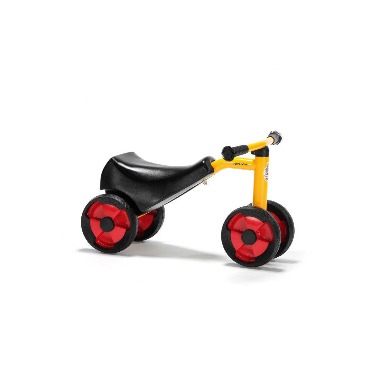 The name says it all. This robust and durable push-along scooter is very stable and attractive to ride for the smallest kids. This could very well be the toddler's very first 4-wheeled adventure. Spokeless wheels with wide tires. Safety handlebars grips. Safe design featuring rounded-off shapes and no sharp edges. Strong nylon bearings for both front and rear wheels.