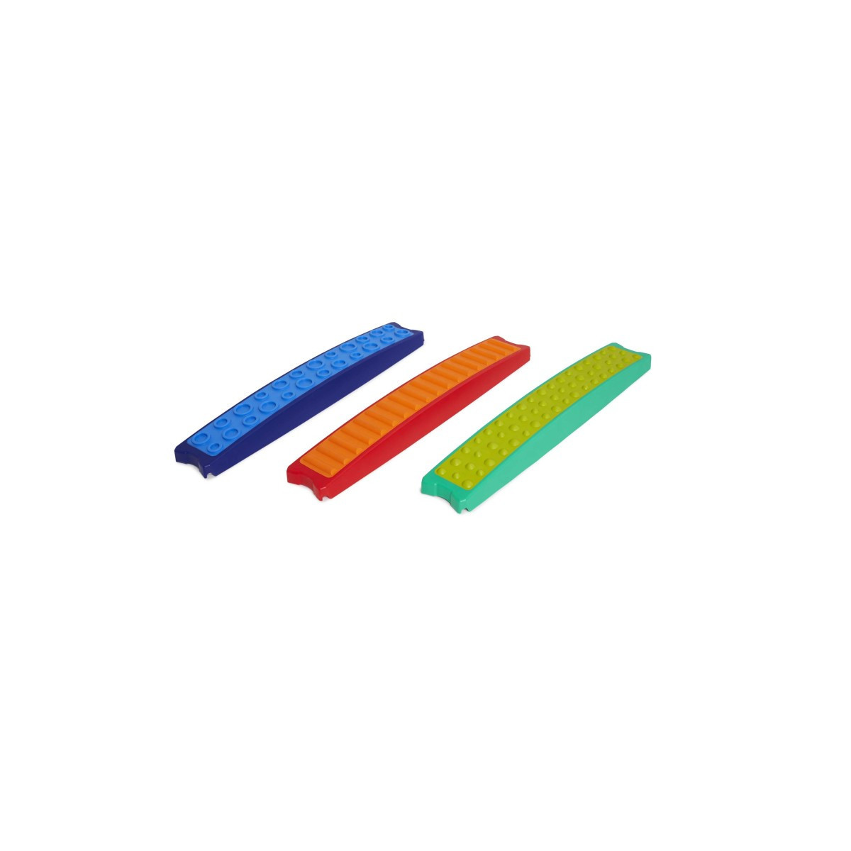 A set of three tactile elements for Build N’ Balance®. Each element comes with an easily identifiable tactile structure, with which children soon become familiar when they use the elements without shoes. Children are attracted to the bright colors, which encourage them to pay more attention to the various tactile structures. This new set of elements adds versatility to all the activities children can already engage in with the existing Build N’ Balance® elements. This new set specifically encourages tactile sensory training. The tactile structures are made from nice-to-touch artificial rubber.