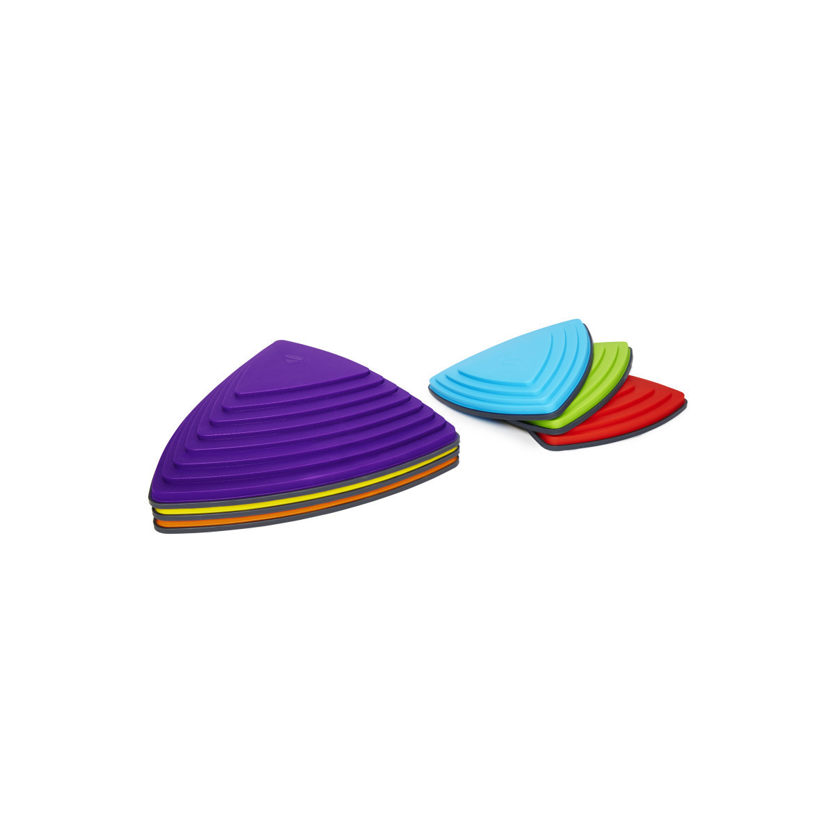 The River Stones are designed to improve coordination and balance. Jumping or stepping from stone to stone develops a child’s confidence in their ability to judge distances. The side of each triangular block varies in steepness and difficulty, and the layout can be changed to make a pathway more or less challenging. Each stone has a non-slip rubber rim, which also protects indoor surfaces. River Stones can be conveniently stacked for storage. Each set includes 6 stones in 6 colors: three measuring 14.96" x 14.56" x 3.35" and three measuring 10.23" x 10.23" x 1.77".