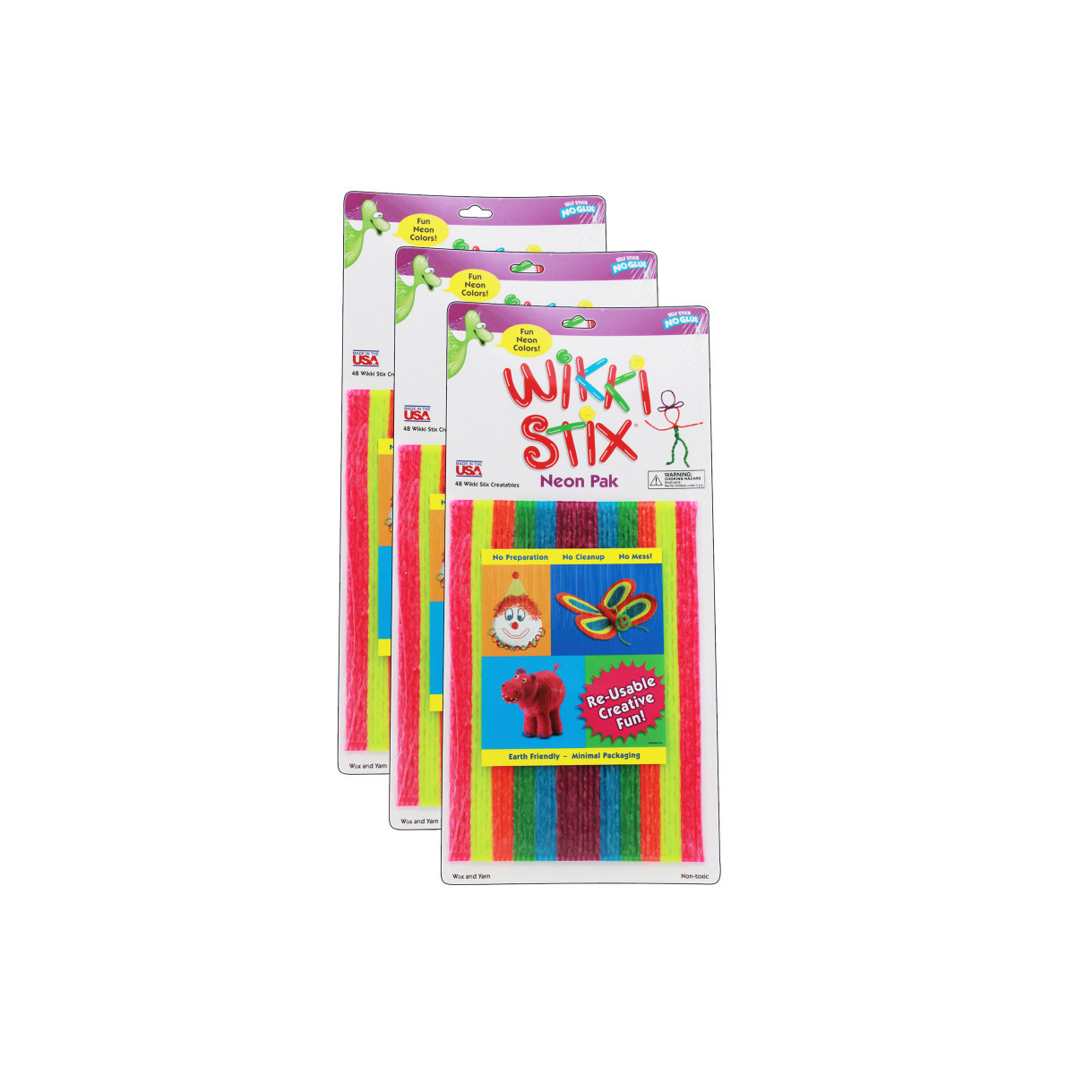 Perfect for home and ideal for last-minute class projects. Wikki Stix are the timeless toy for hands-on fun and traditional play... plus perfect for educational activities and class projects. More fun than a toy... more creative than a craft! Widely used in schools, Wikki Stix conform to ASTM D-4236, and all CPSIA safety regulations. Recommended for ages 3 and up. This no-frills package offers lots of Wikki Stix creativity! Wikki Stix measure 8" long. Shape, stick, play and learn! Colors include: Hot pink, Brite Yellow, Tangerine orange, Lime Green, Electric Blue and Bright Purple. Each pack includes 48 Wikki Stix in primary colors and illustrations, play and craft ideas on the back. Sold as 3 packs for a total of 144 Wikki Stix.