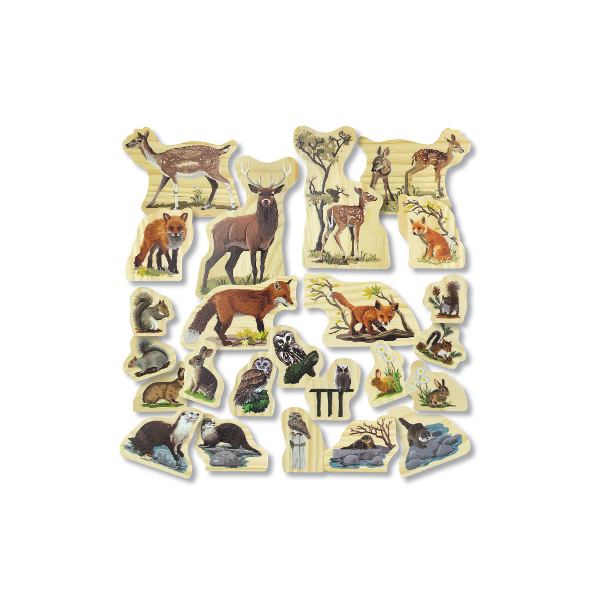 - The set is made from FSC pine and is divided into six families: deer, fox, otter, owl, rabbit, and squirrel.