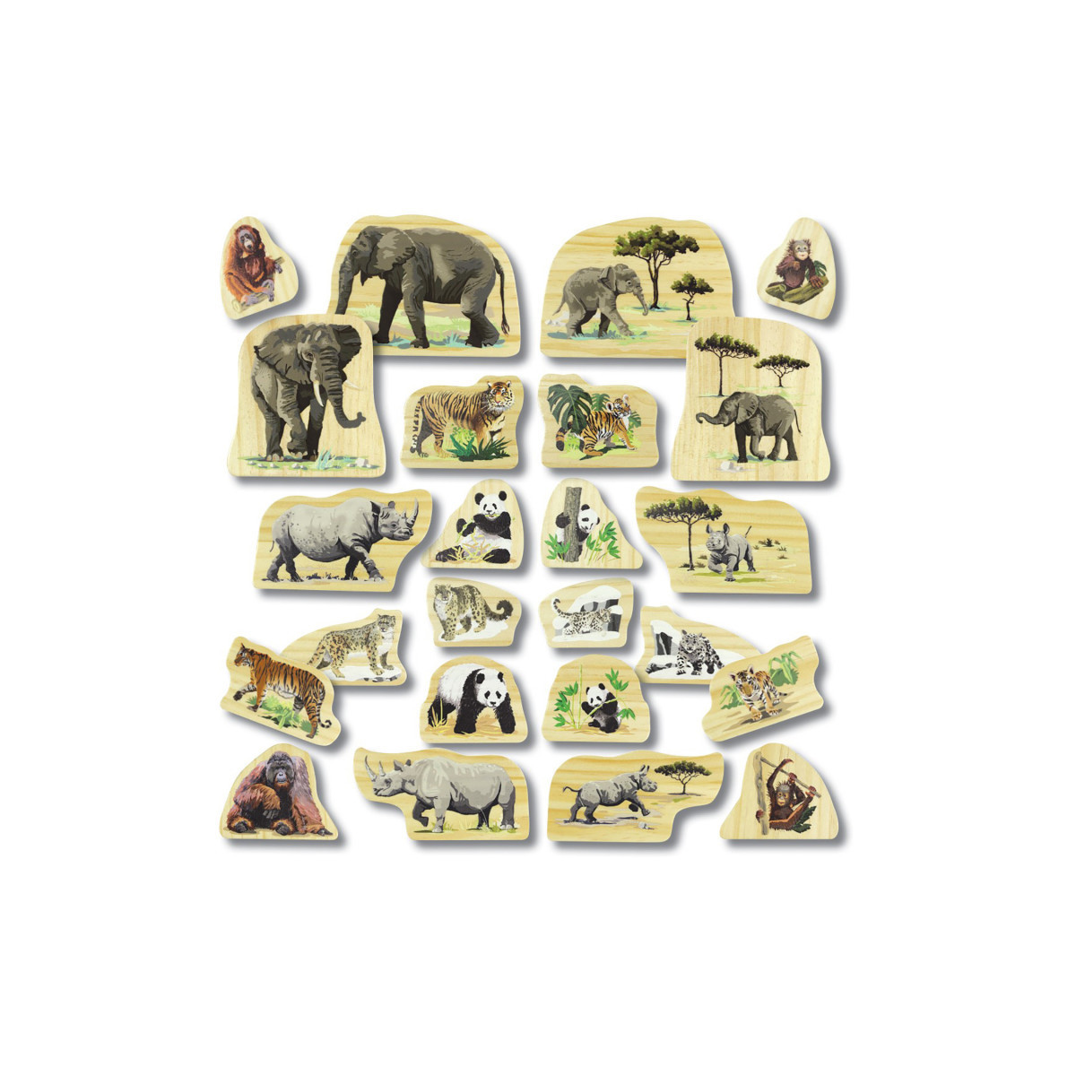 - The set is made from FSC-certified pine and is divided into six families: elephant, orangutan, panda, rhinoceros, snow leopard, and tiger.
