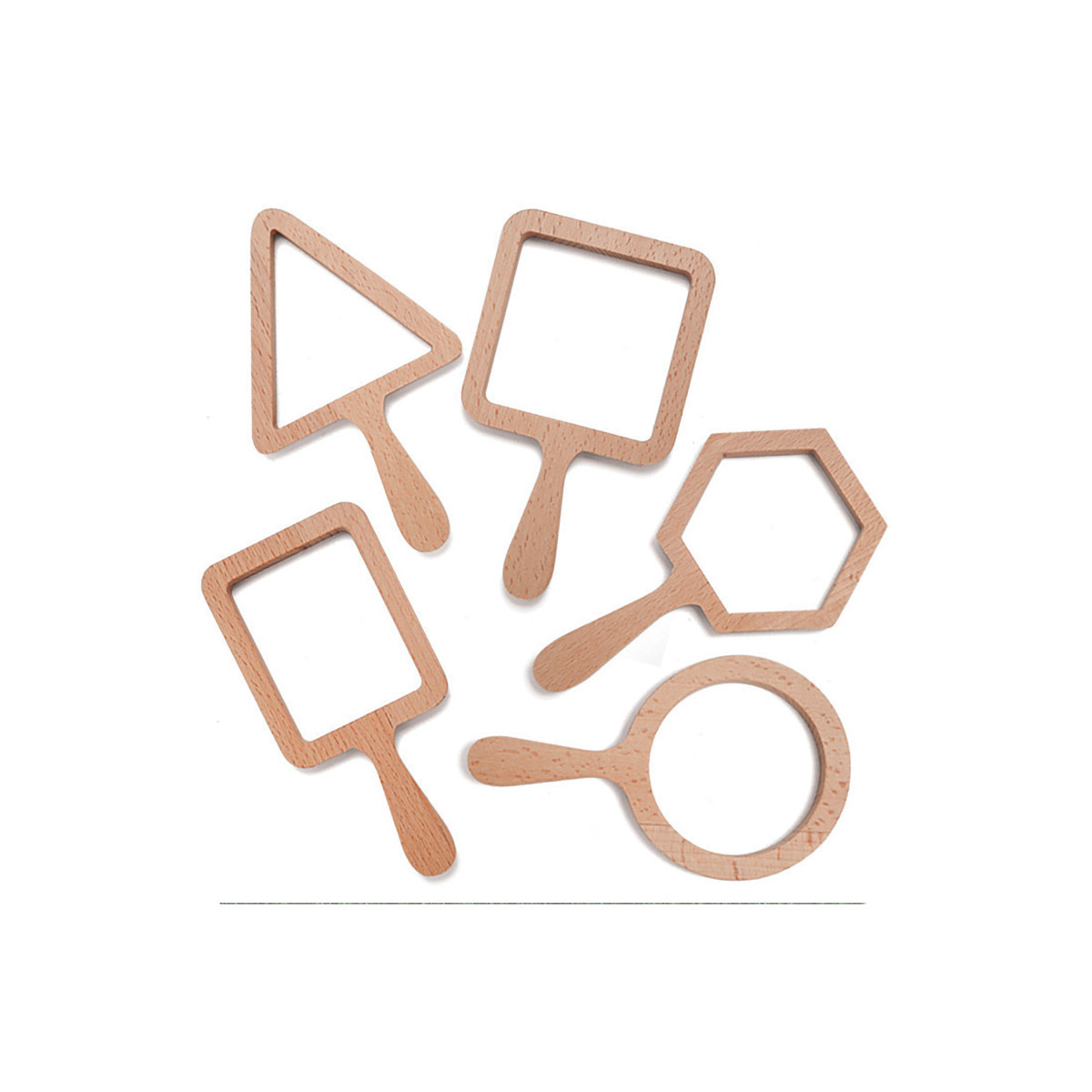 - Set of 5 wooden viewers: Includes circle, square, rectangle, triangle, and hexagon shapes.