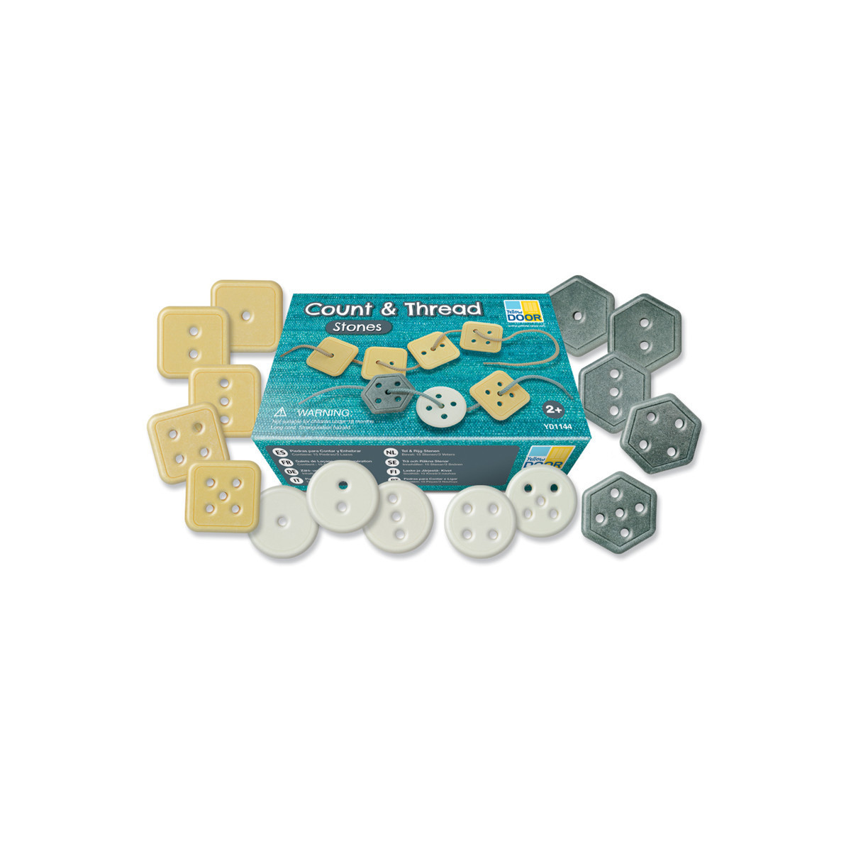 These versatile stones will develop recognition of shape and number, as well as improving fine-motor skills. Sort the stones by color and shape (circle, square, hexagon), then count, order and thread them together. Each set includes 15 tactile stones (measuring 2") and three soft, chunky laces. Safe for children aged 2+.