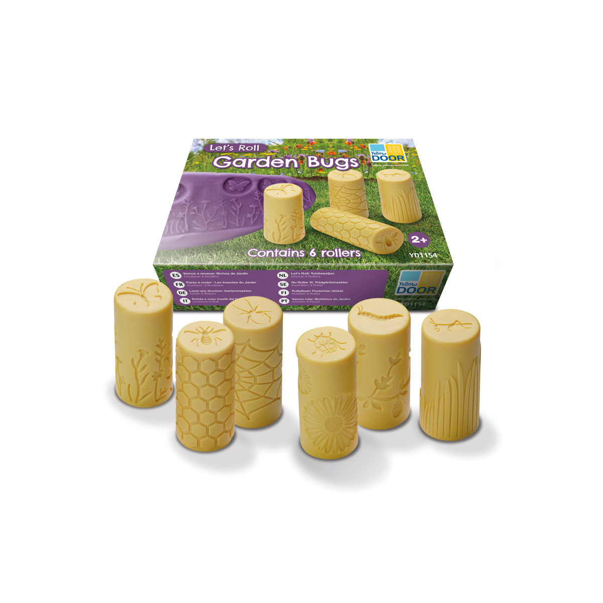 These rollers offer an imaginative way for children to explore the natural world through creative play. Roll into play dough or clay and stamp with the bugs to create hands-on habitats! Count the bees on the honeycomb, match the ladybugs to flowers and tell stories of what is happening close by when you look carefully. Children can experiment using different amounts of pressure and rolling in different ways, honing their fine motor skills as they create tactile patterns and beautiful works of art. The set includes the following bugs and their habitats: butterfly and meadow, bee and honeycomb, spider and web, ladybug and flowers, caterpillar and branch, grasshopper and grass. Made from our durable stone mix, each set contains six rollers (each measuring approximately 3" x 1-1/4") and are easy to clean. Safe for age 2+.