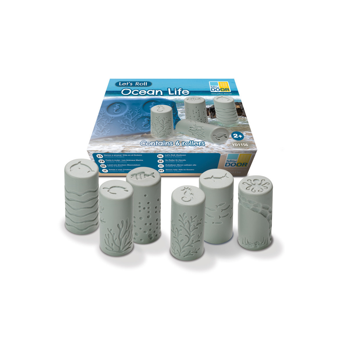 Explore precious and enticing ocean habitats with this set of creative rollers. Roll into play dough or clay and use the stamps to bring the water to life with a variety of sea creatures. Count the dolphins diving in the water, follow the fish through the bubbles and create tactile story adventures for the whole cast of characters! Children can practice their motor skills using different amounts of pressure and rolling in different ways, time and time again. The set includes the following ocean creatures and their habitats: dolphin and waves, turtle and coral, fish and bubbles, seahorse and seagrass, shark and fish, octopus and cave. Made from our durable stone mix, each set contains six rollers (each measuring approximately 3" x 1-1/4") and are easy to clean. Safe for age 2+.