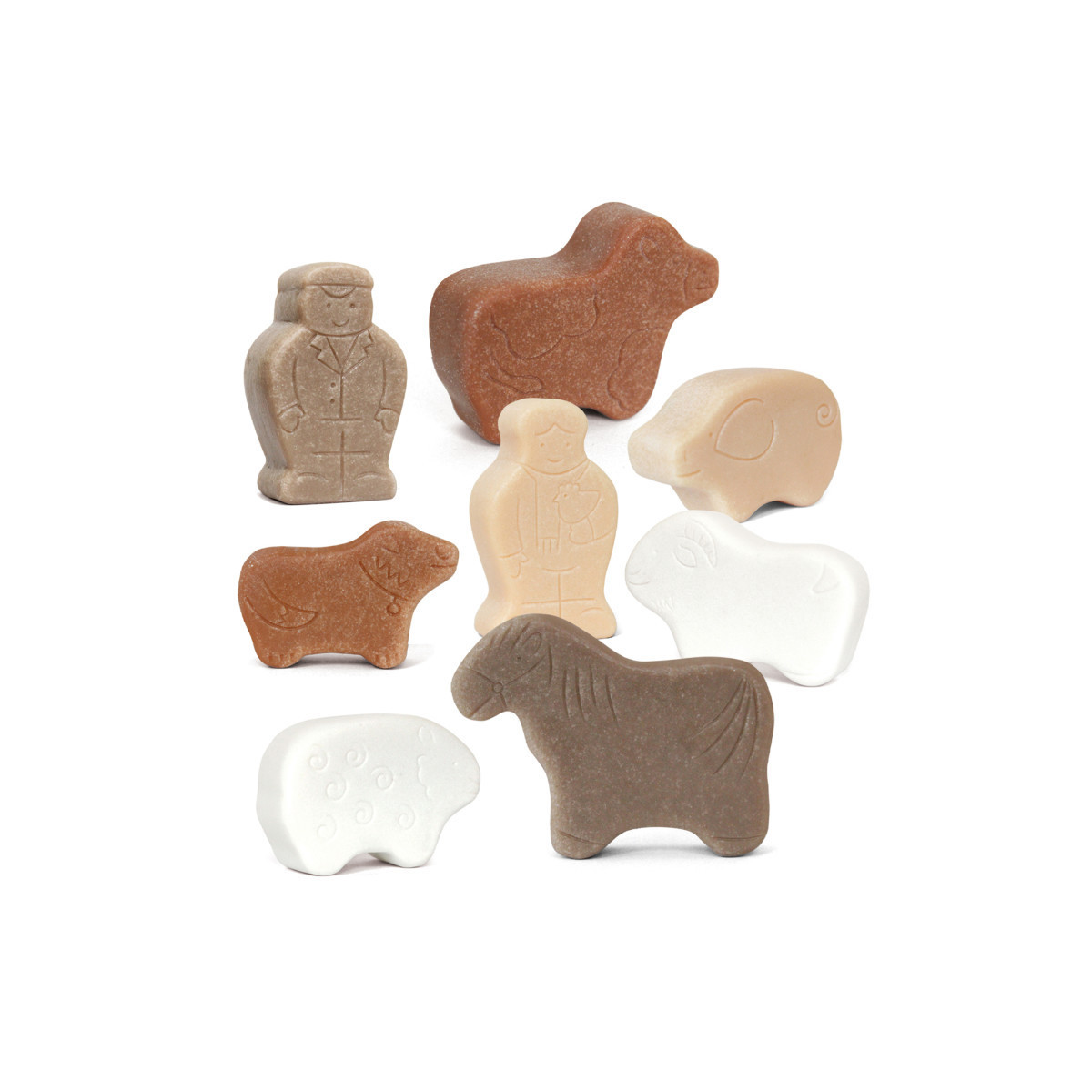 - The set includes one each of the following: cow, dog, goat, horse, pig, sheep, female farmer and male farmer.
