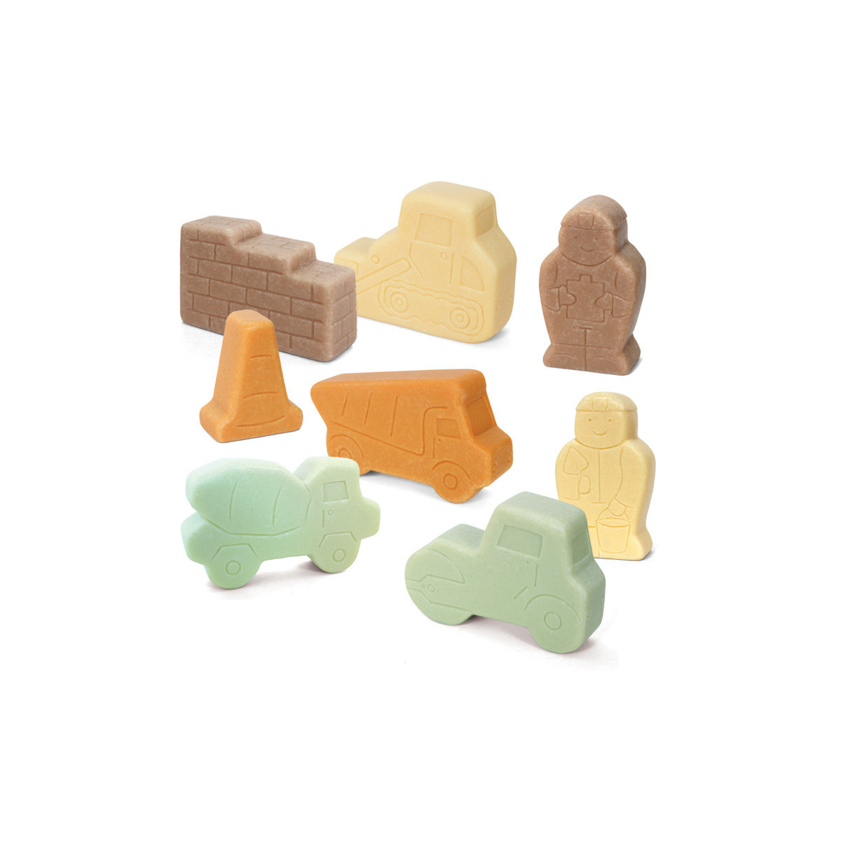 - The set includes one each of the following: bulldozer, concrete mixer, dumper truck, road roller, female worker, male worker, partially-built brick wall, and cone.