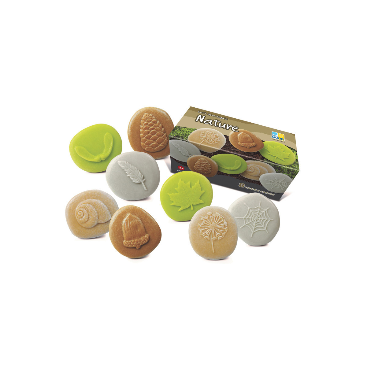 Each set contains 8 stones: acorn, dandelion seedhead, feather, maple leaf, maple seeds, pine cone, snail shell, spider’s web. Stones measure approximately 3". Safe for 2+.