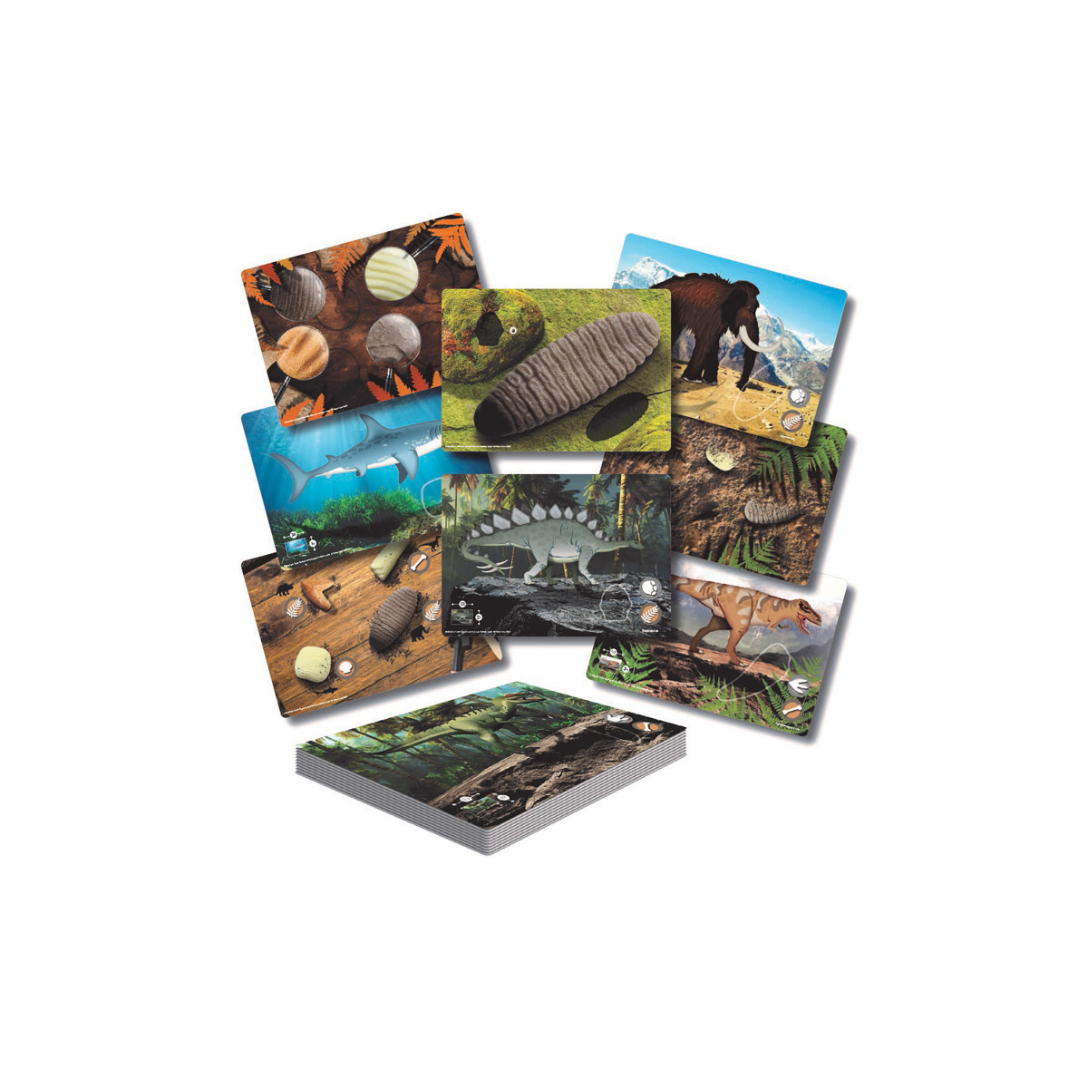 Covers the following prehistoric animals: Allosaurus, Iguanodon, Mammoth, Pliosaur, Ptychodus, Stegosaurus, Triceratops and Tyrannosaurus rex. Made from durable plastic, the cards are tough enough for use in the outdoor area (including water play). Each set includes 16 cards measuring 8" x 11".