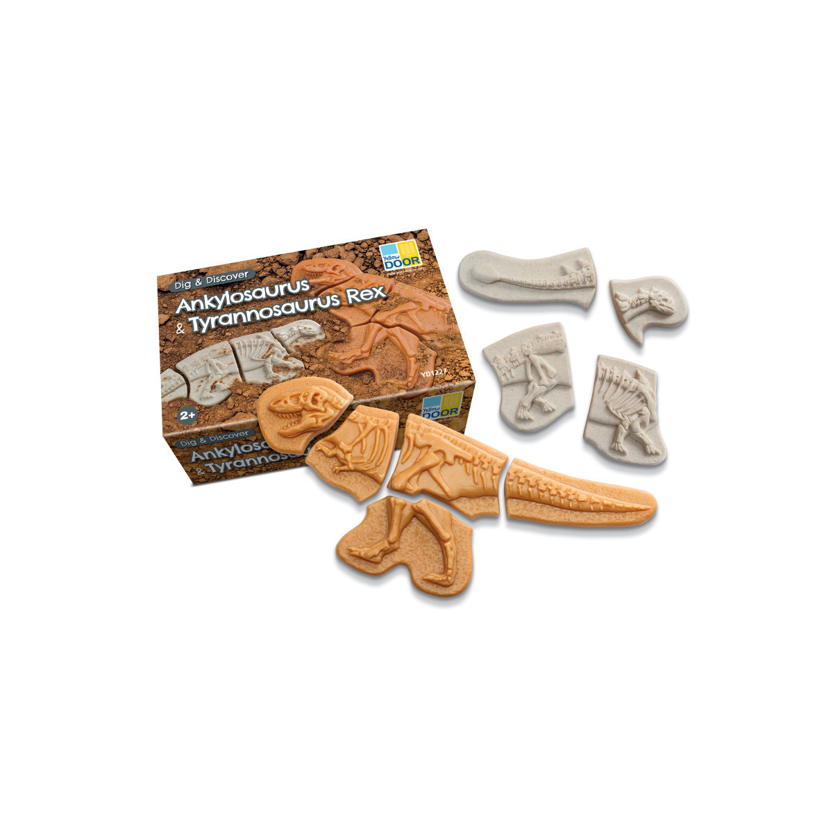 - Tactile skeleton pieces that fit together to create two iconic dinosaurs: the mighty Tyrannosaurus rex and the armored Ankylosaurus.
