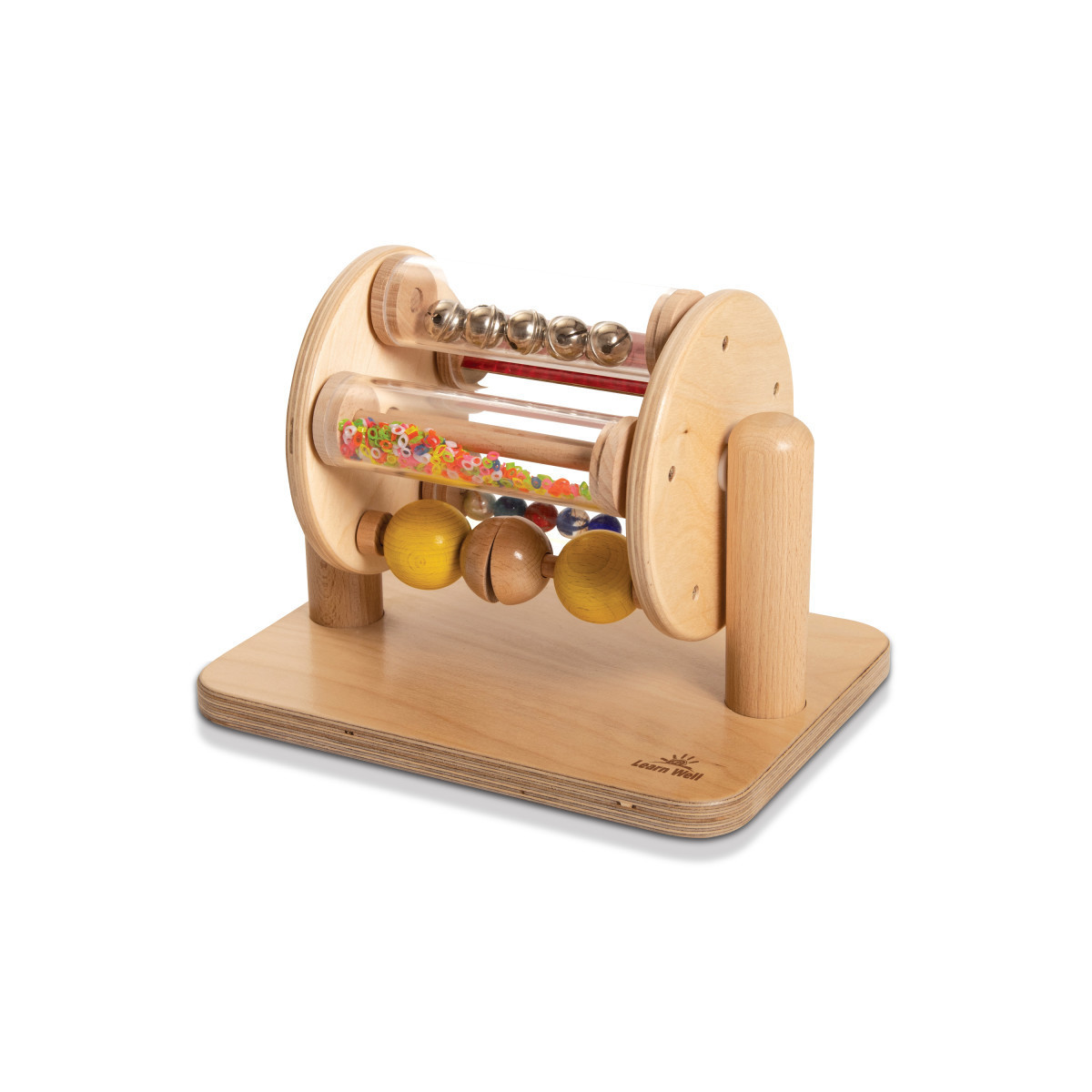 This stimulating Sight and Sound Drum features four individual tubes which each enclose a different visually engaging material, as well as featuring a set of clacking wooden spheres