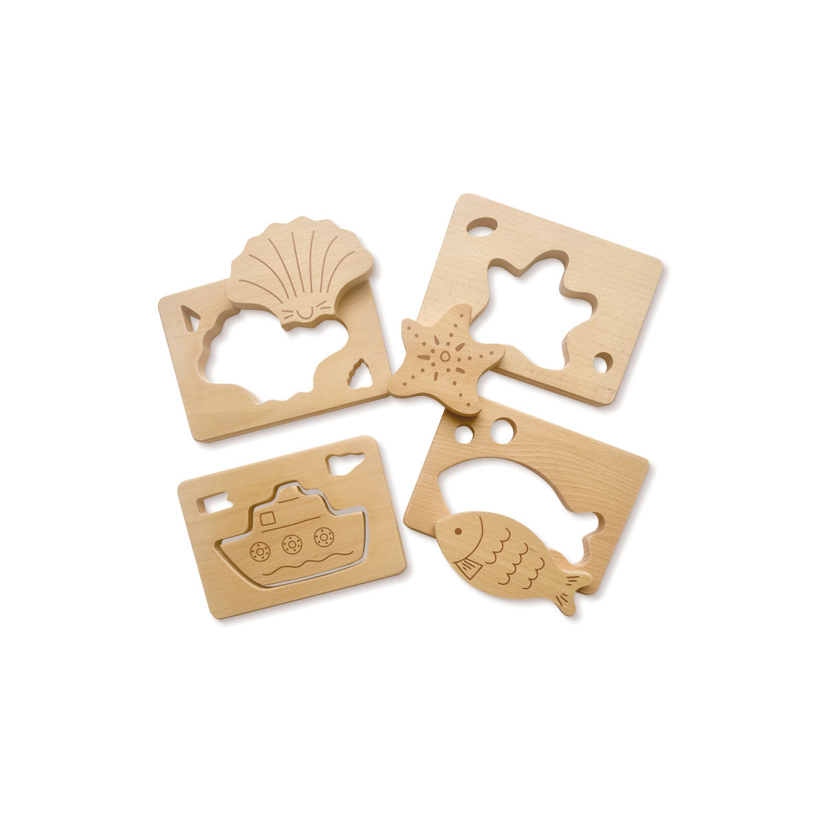 - Set of four shapes, 8 pieces: Boat, Starfish, Seashell and Fish