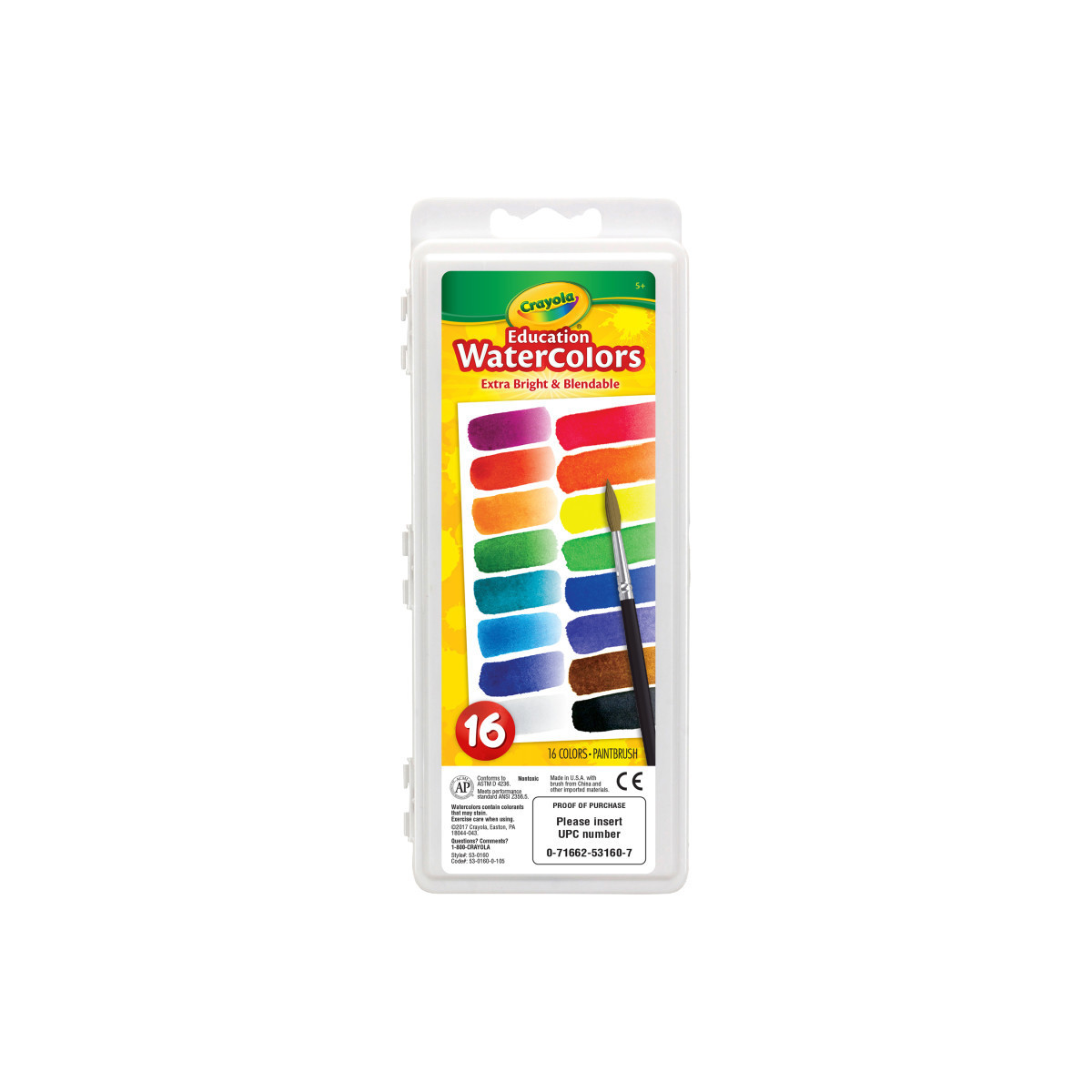 Unleash your child's inner Picasso with the vibrant and versatile Crayola Watercolor Paint Set! This set boasts 16 watercolor paints in an array of gorgeous, bold hues, providing a kaleidoscope of possibilities for your little artist to create stunning masterpieces. With both primary and secondary shades, the colors blend beautifully, making it easy to achieve the perfect shade. These water-based paints are a breeze to use and clean up with just soap and water, making them the go-to choice for quick and easy painting projects. Best of all, kids can use the included paint brush to dive right in and start creating right away! Stock up on classroom supplies or at home craft sets with versatile watercolor paints that are great for group projects or rainy day activities, and pair watercolor paper or Crayola Watercolor Paint Pads (sold separately) for a smooth and vibrant finish that will make your child's art pop. Each of the paints in this set are safe, nontoxic, and make a great gift for kids ages 4 and up.