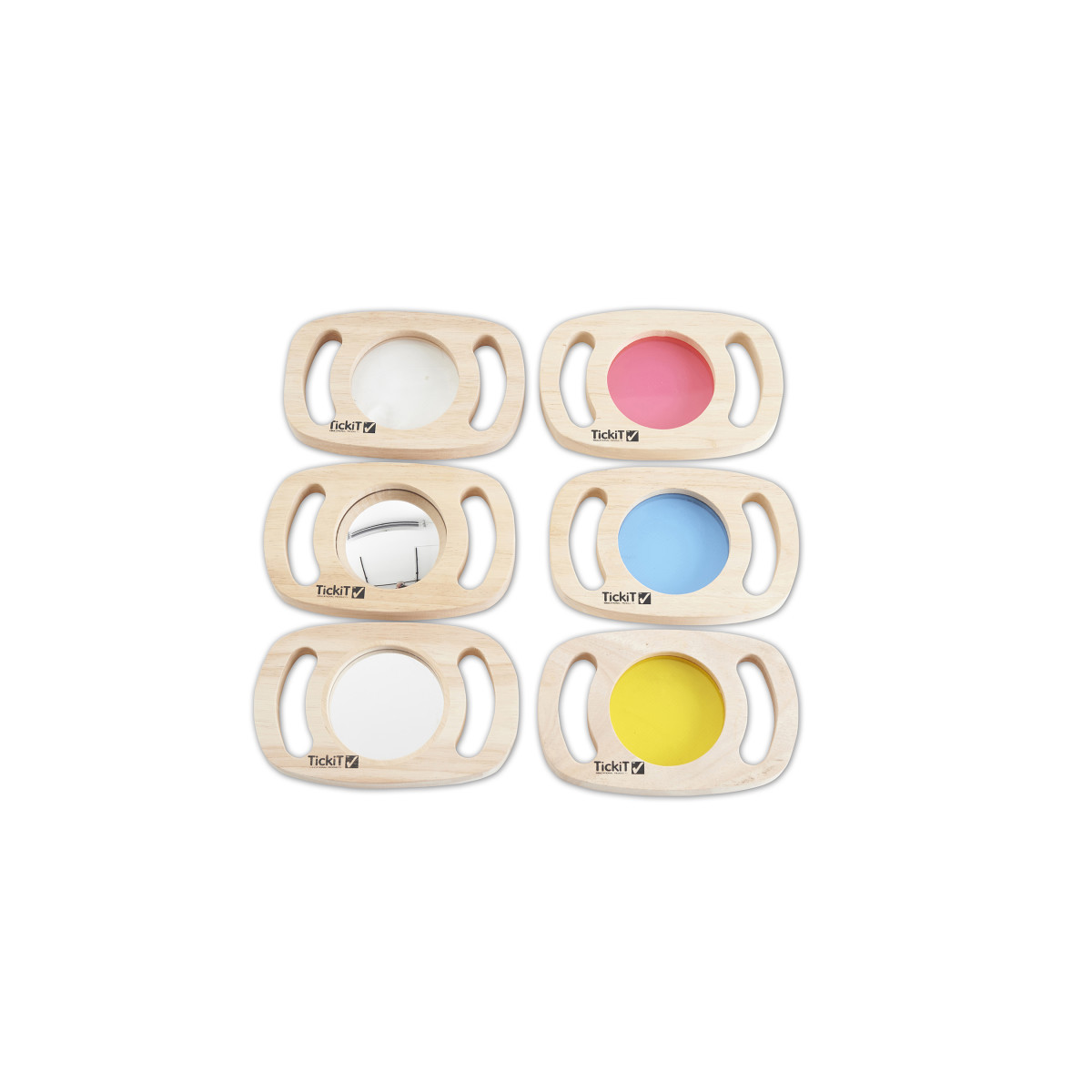 A 6-piece set allowing children to see the world through new eyes. With lenses to change the color of everything they see, a giant magnifier and mirrors to give true and distorted reflections of the world around them. Can be stacked for color mixing and for use on a light panel. Set includes transparent acrylic in red, blue and yellow, magnifying lens (with 3x magnification), two sided convex/ concave mirror and plane mirror. Frame size 7.25" x 4.75" x .75" (insert size 3.25" diameter). Great for toddlers 12m+!