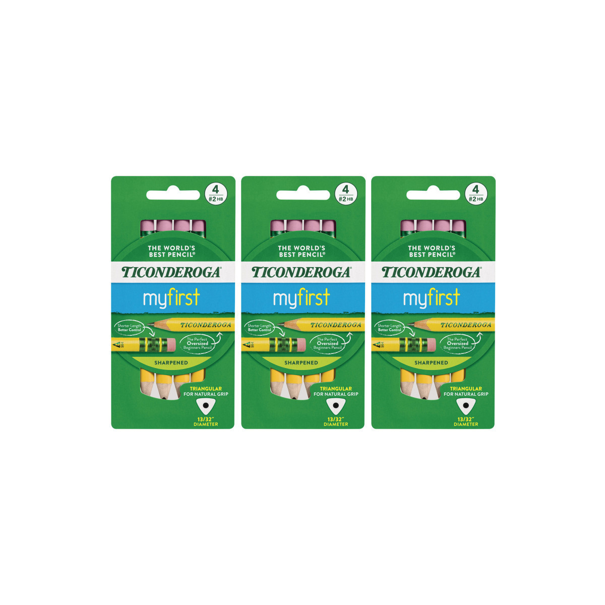 Ticonderoga® My First® short length (4.5") pencils deliver better control and promote a more natural grip as recognized essential by experts in early learning handwriting. The large diameter (13/32") reduces writing fatigue and the triangular shape promotes the correct 3 finger grip. Premium wood harvested from responsibly managed sources provides smooth, even sharpening with minimal breakage. Teachers prefer Ticonderoga® brand for its dependability and craftmanship. All Ticonderoga® pencils are PMA certified so you can use them with confidence. Each pack includes 4 pencils. Sold as 3 packs for a total of 12 pencils.